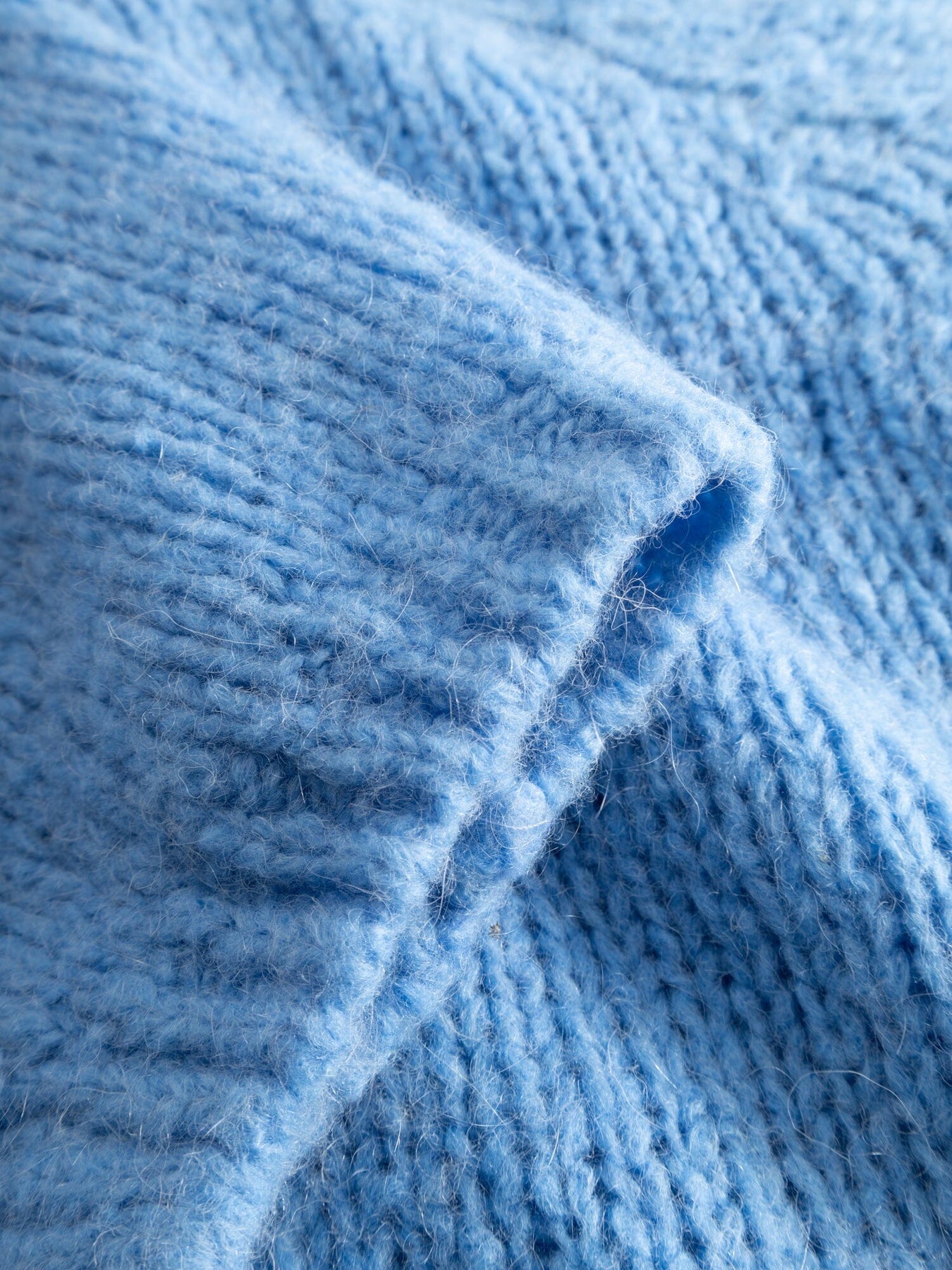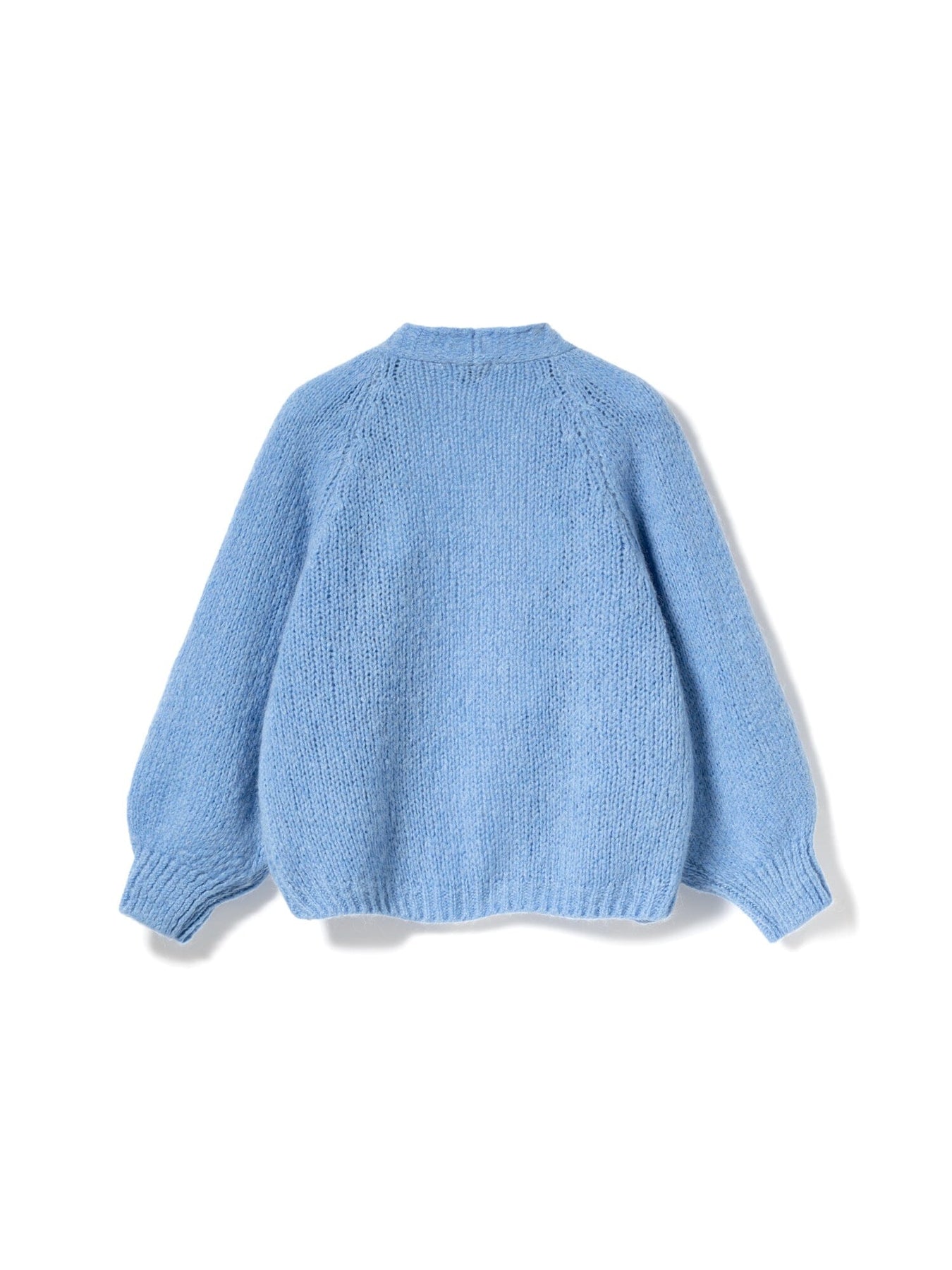 Sininen neulecardigan Noellalta, jossa on löysä malli ja leveät hihat. Siinä on yksinkertainen muotoilu, jossa on ribbireunat ja pitkät hihat.