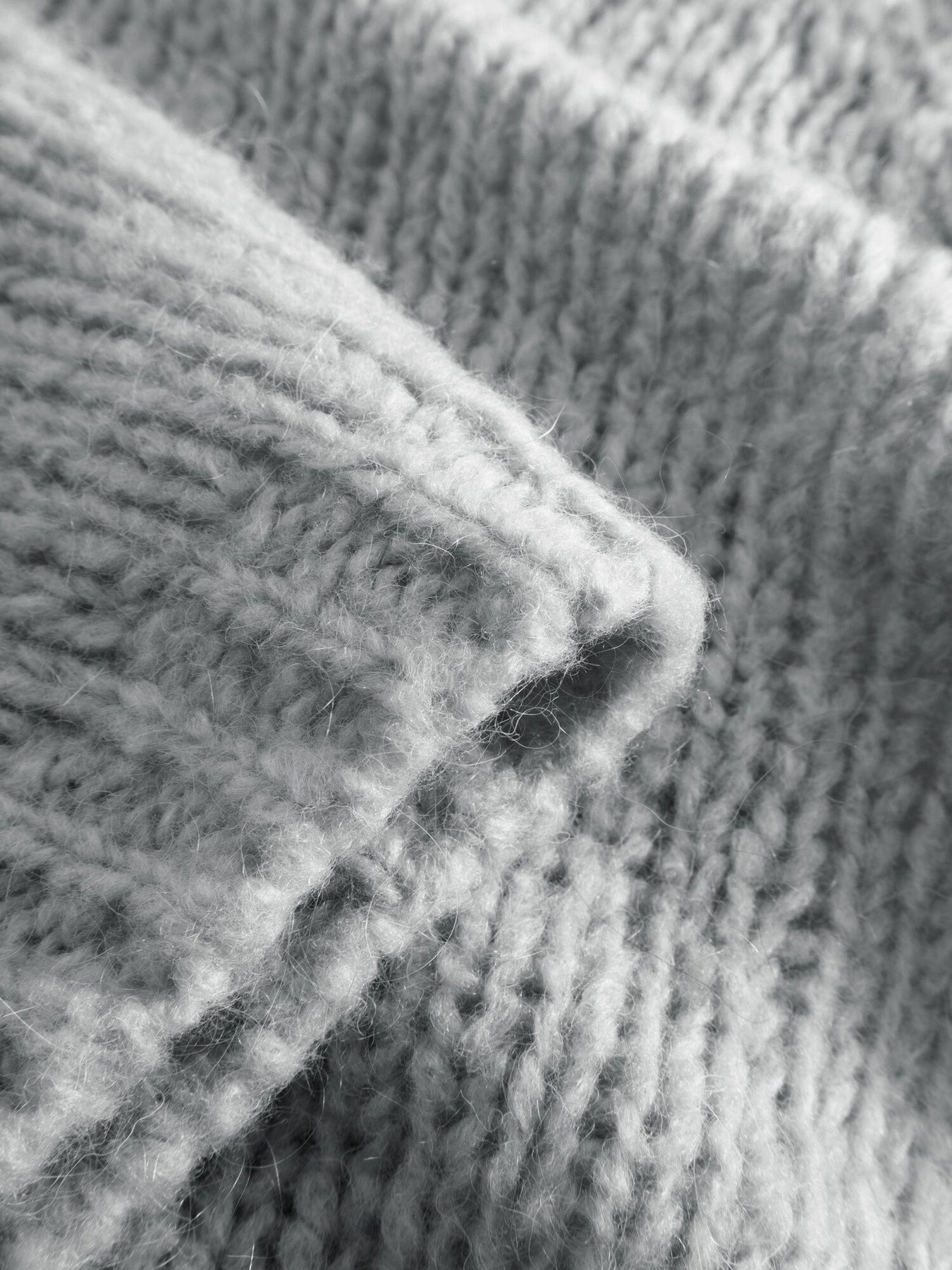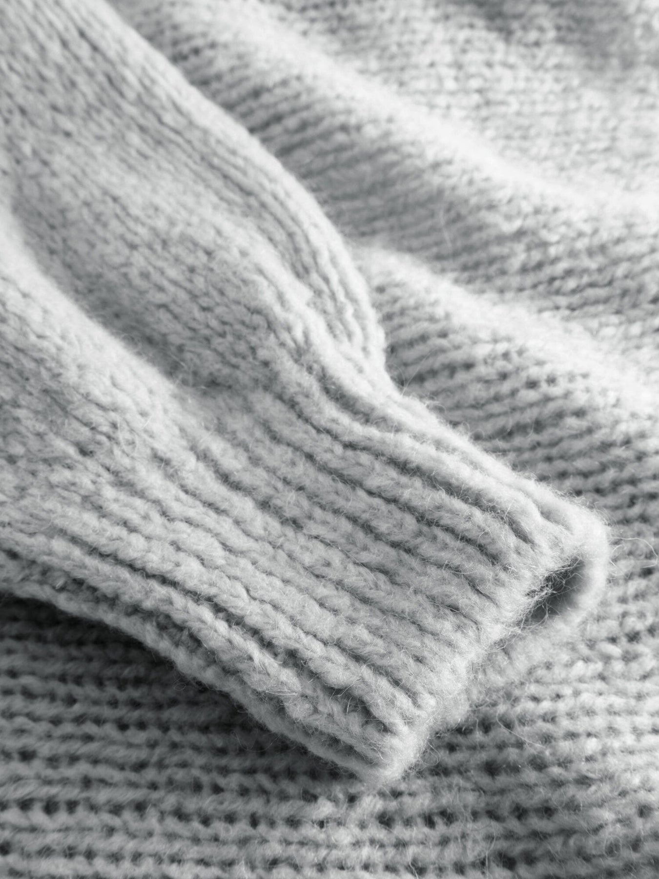 Vaaleanharmaa neulecardigan Noellalta, jossa on volyymimäiset hihat ja rakenteellinen neule. Rentoa istuvuutta ja pyöreä pääntie tarjoavat hyvää tilaa kerrospukeutumiseen.