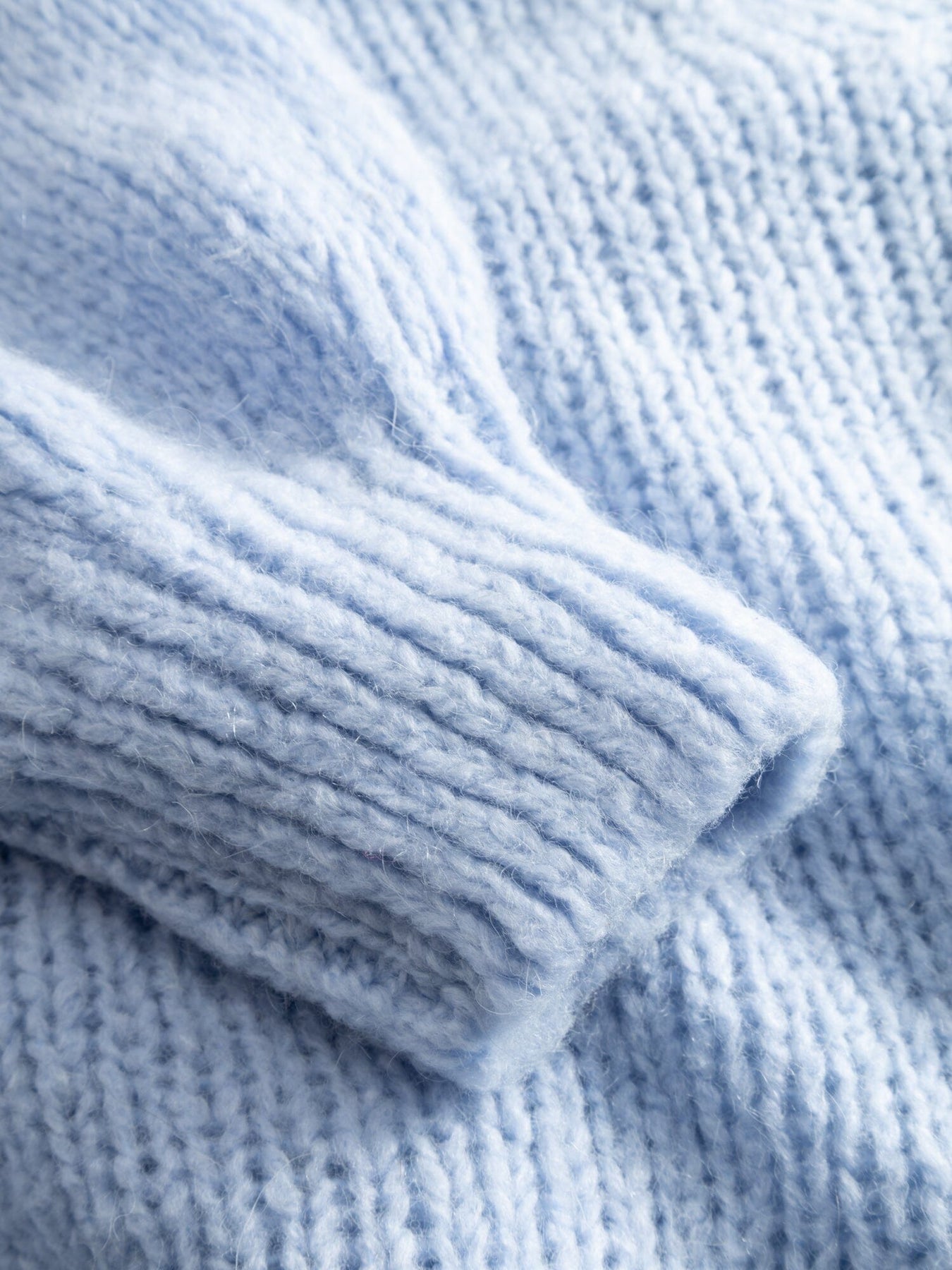 Vaaleansininen neulecardigan Noellalta puffihihalla ja löysällä siluetilla. Pehmeässä neuleessa on avoin etuosa ilman kiinnitystä ja pyöreä kaula-aukko.