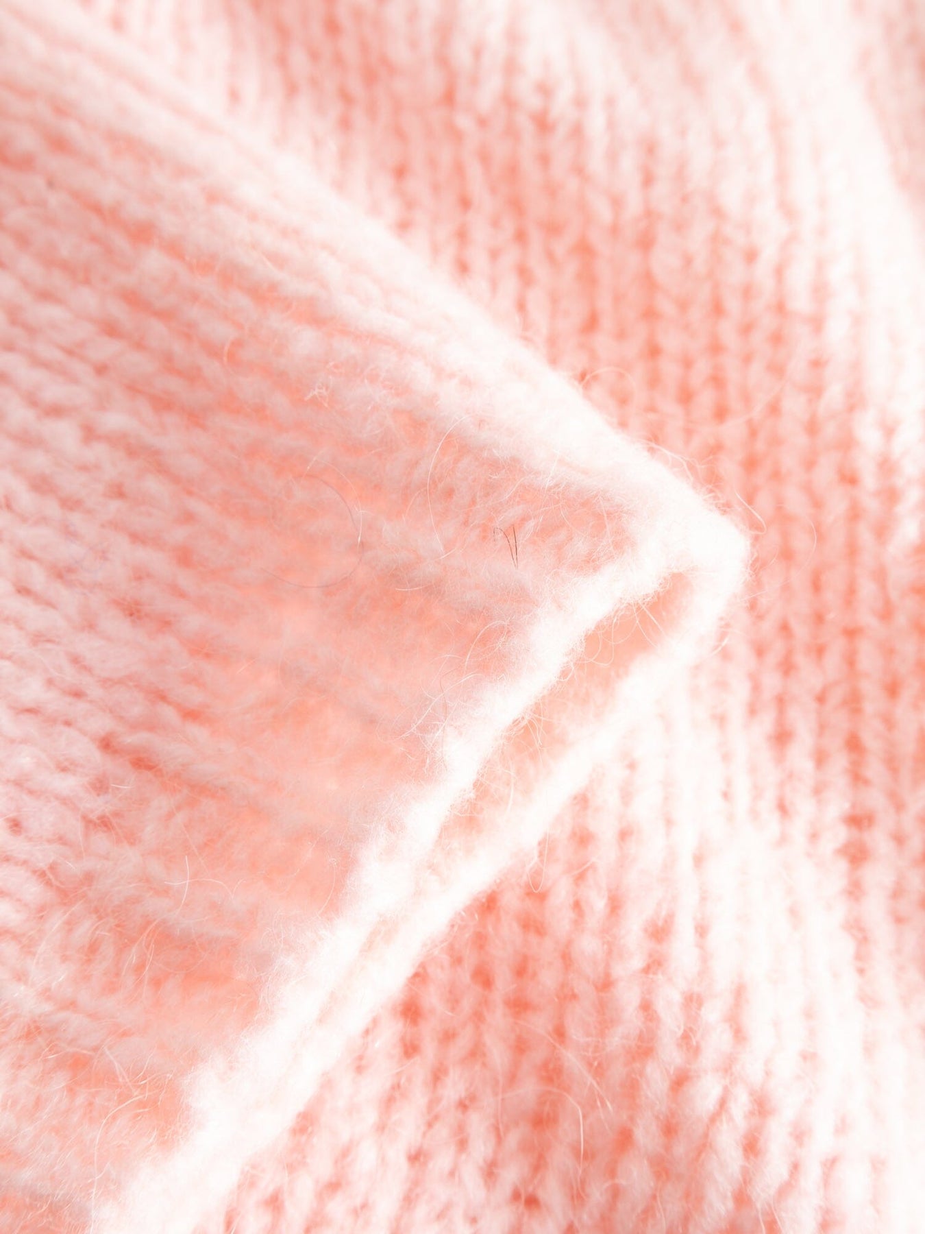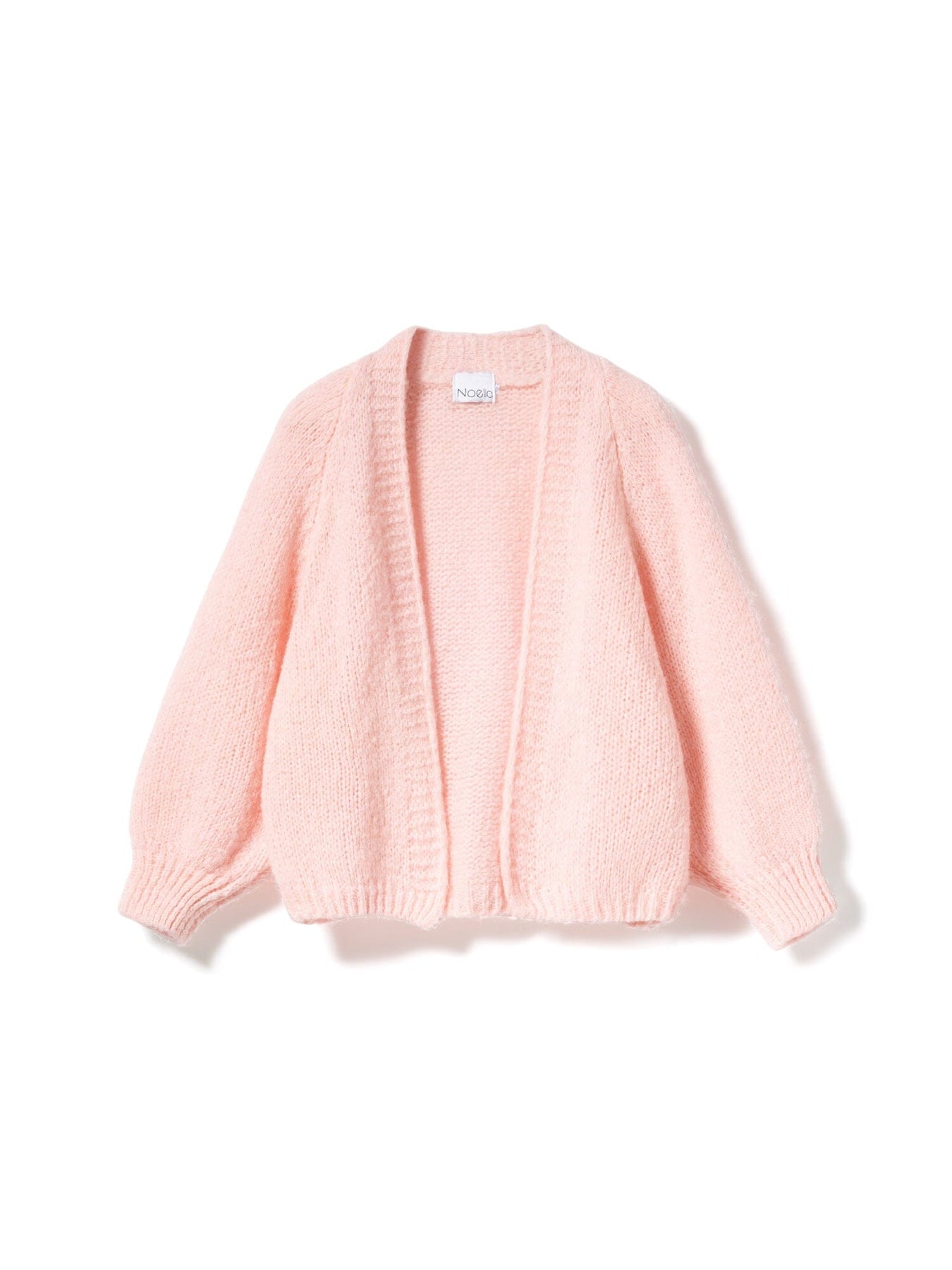 Vaaleanpunainen neulecardigan Noellalta, jossa on löysä malli. Siinä on puffimaiset hihat ja avoin etuosa ilman kiinnitystä.