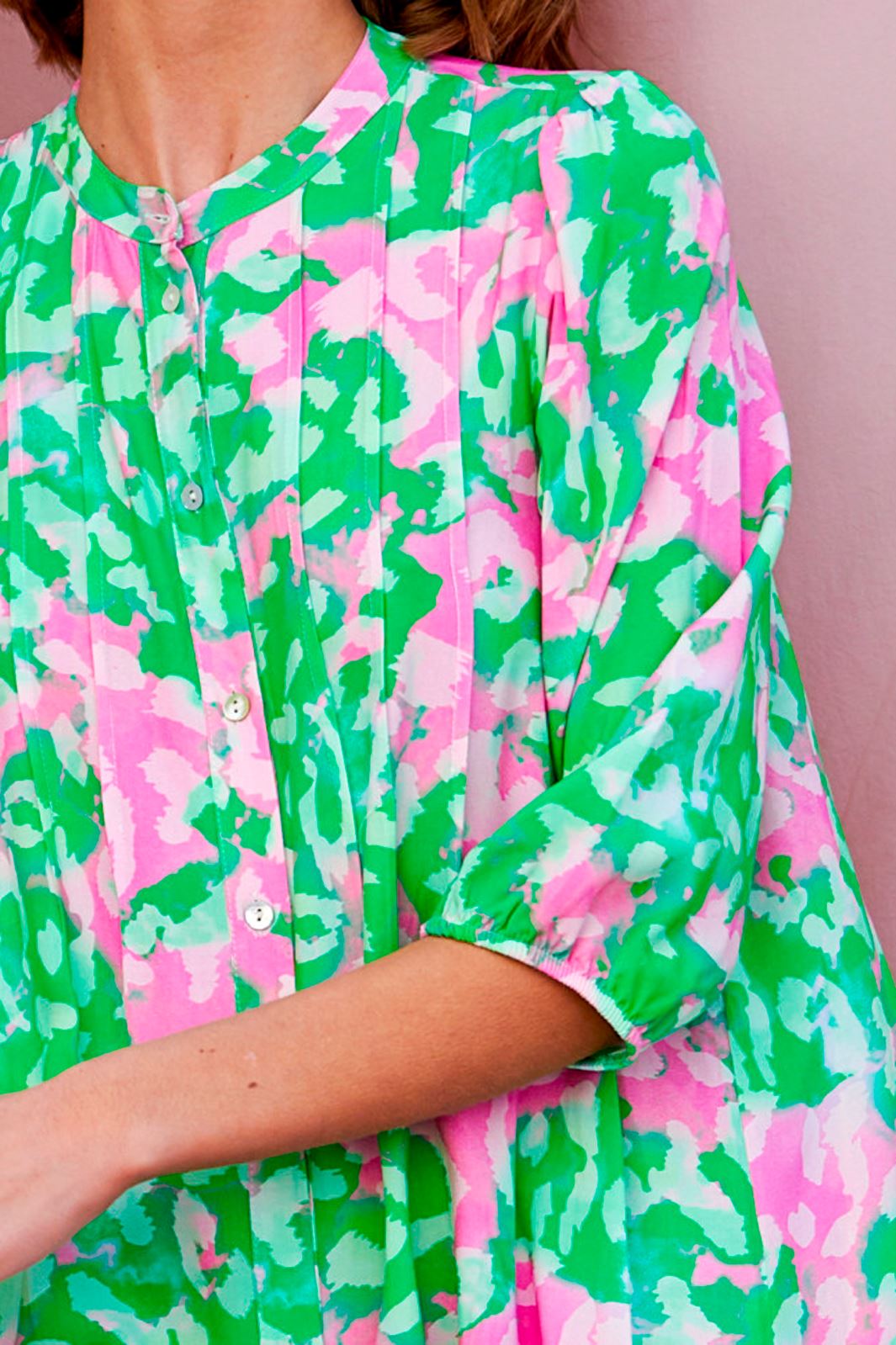 Noellan vihreä ja vaaleanpunainen paitamekko, jossa on abstrakti naamiointikuosi. Mekossa on nappikiinnitys edessä ja paitakaulus, jossa on 3/4-hihat.