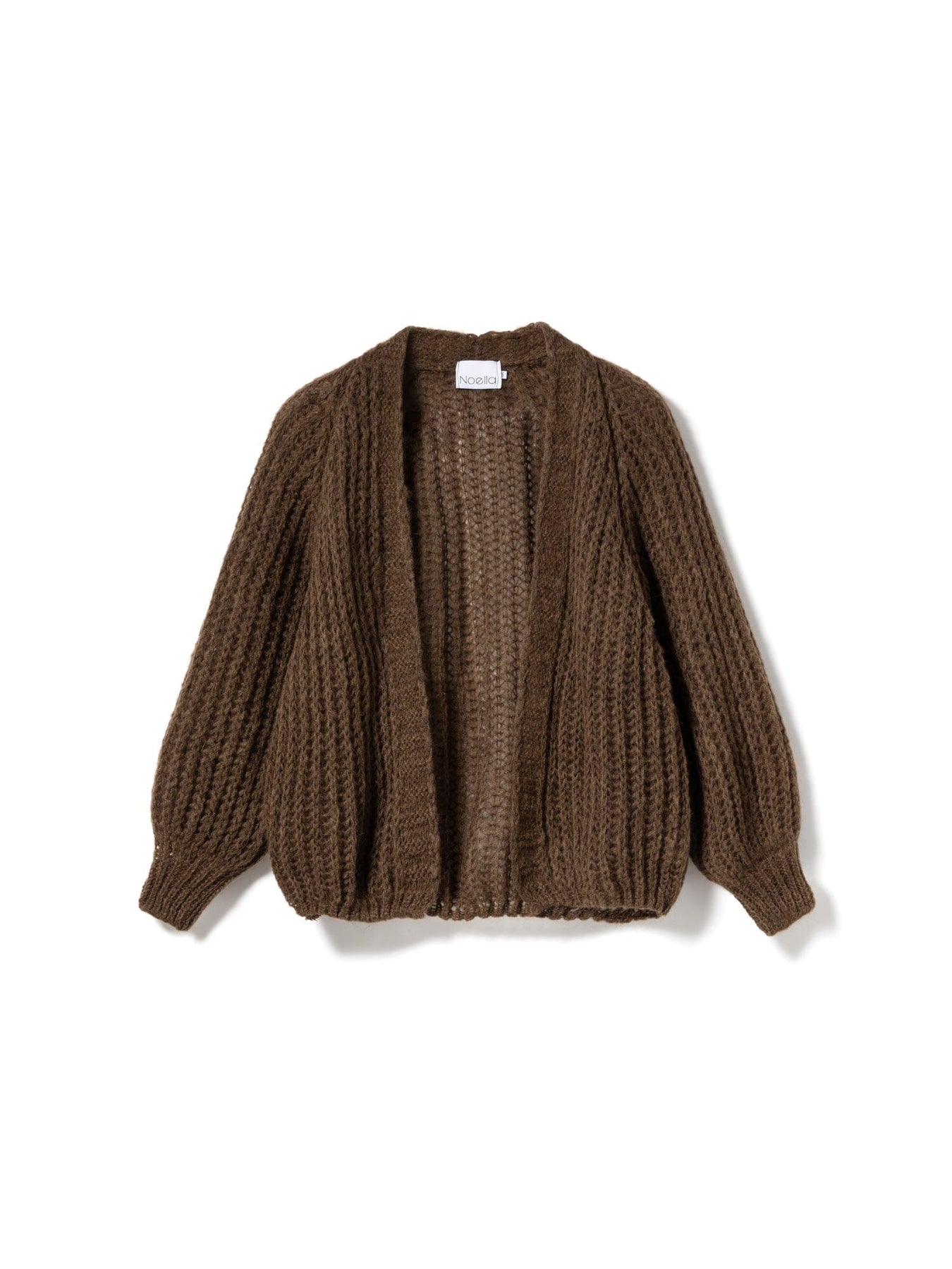 Ruskea neulecardigan Noellalta, jossa on avoin rakennekuvio. Rentomallinen malli, jossa on pallomaiset hihat ja avoin etuosa ilman kiinnitystä. Se on neulottu meleratusta suklaaruskeasta sävystä.