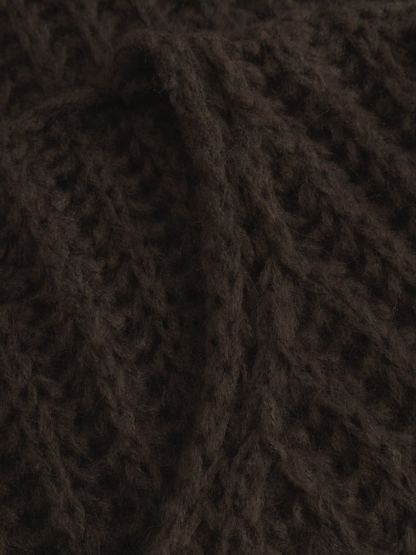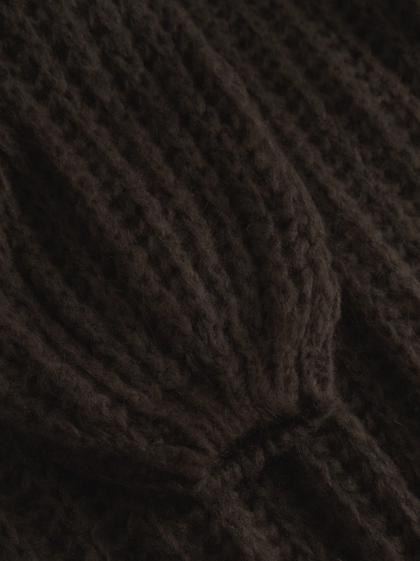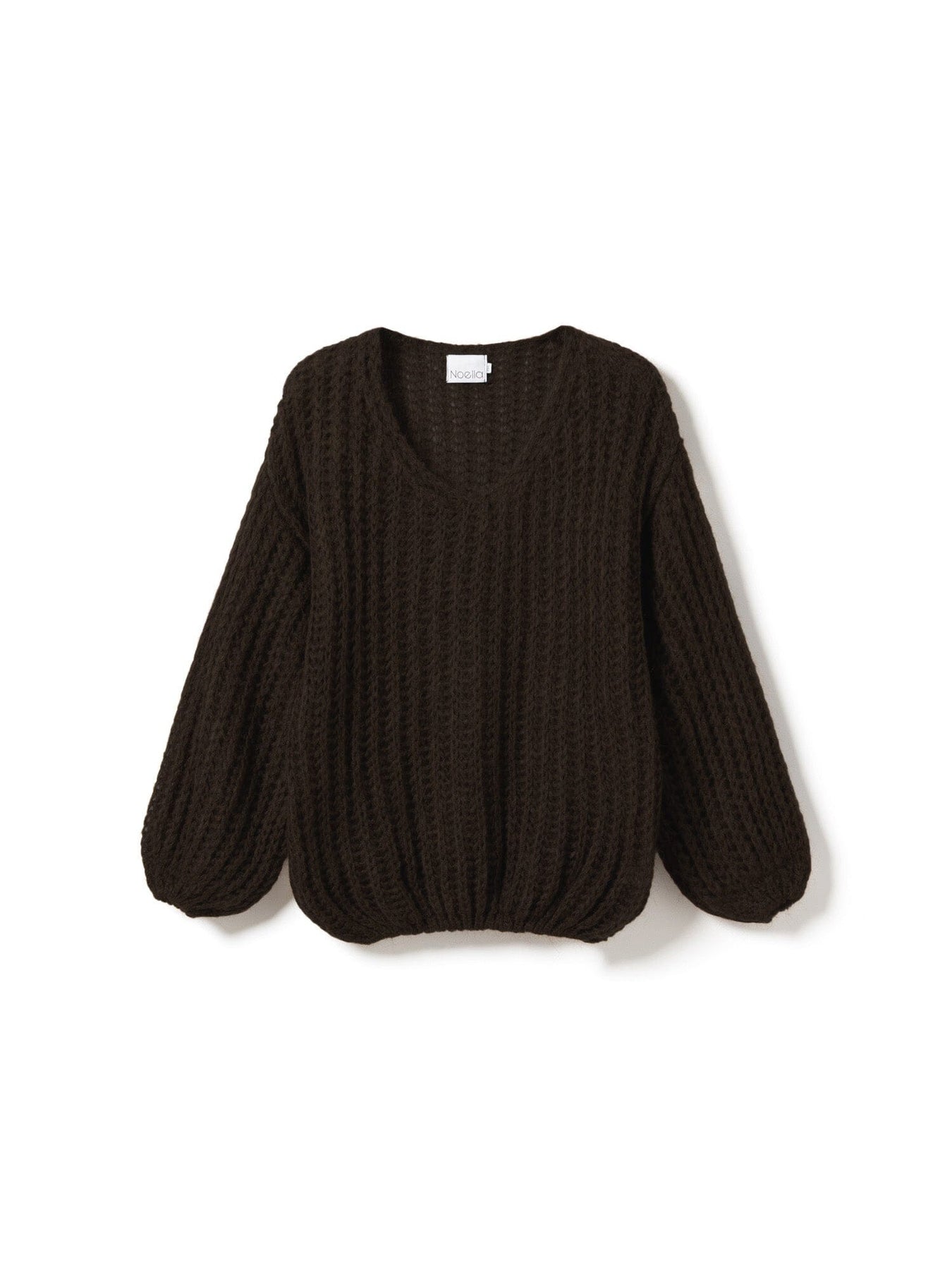 Tumma ruskea neulepaita Noellalta, jossa on ribbineulepinta ja volyymimäiset hihat. Paidassa on löysä malli ja lasketut olkapäät.