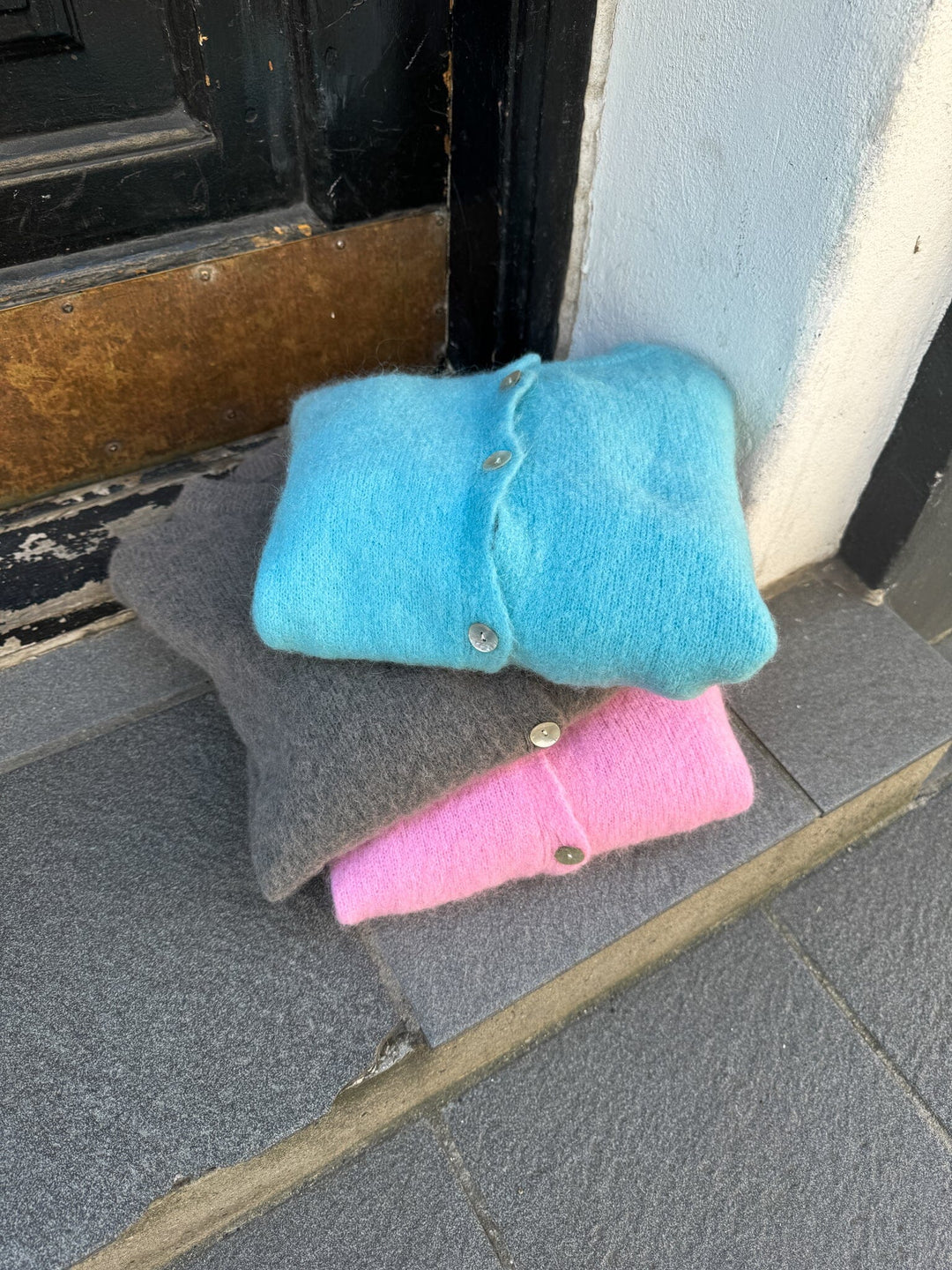 Noellan neulecardigan vaaleanpunaisena suurilla napeilla. Leveä, aaltoileva hiustyyli ja O-mallinen kaula-aukko antavat cardiganille rentoa ilmettä.
