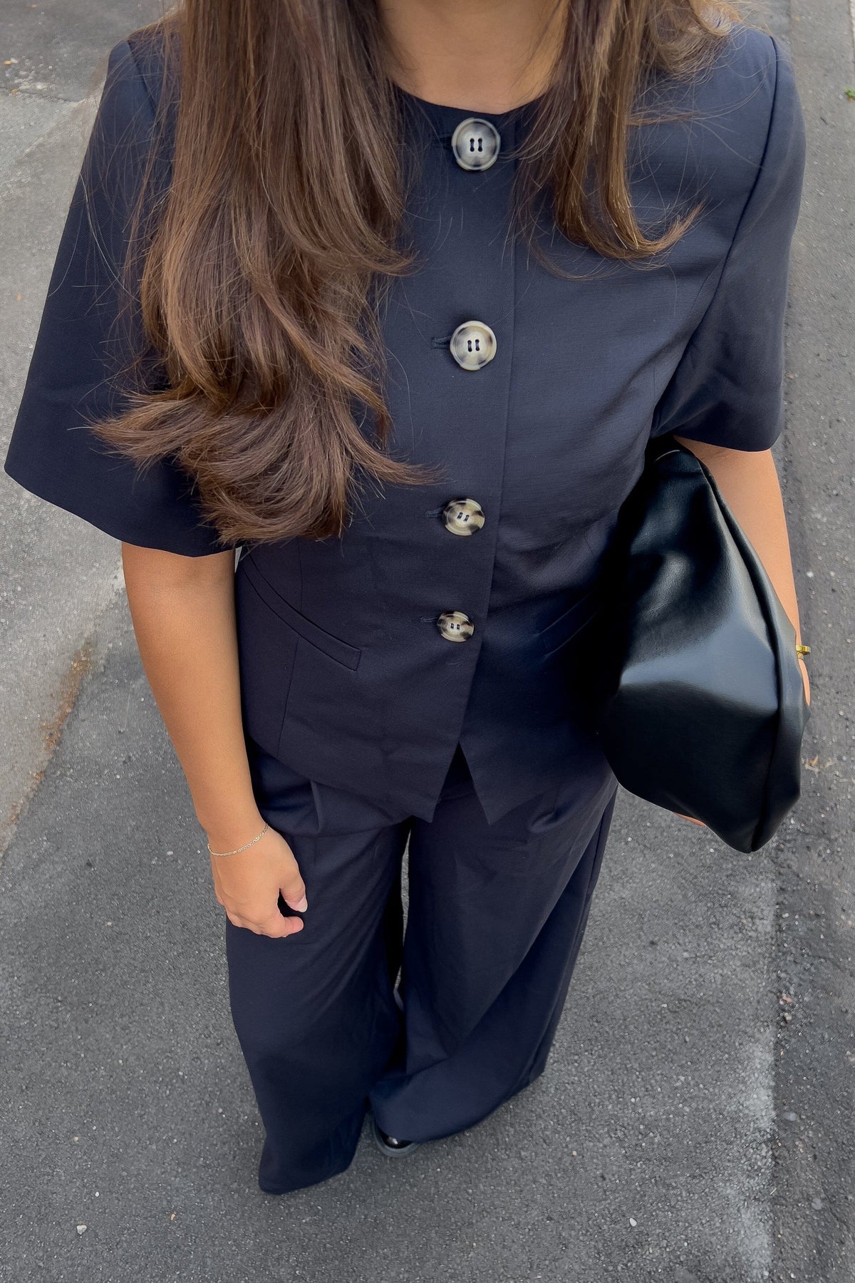 Musta bleiseri Noellalta lyhyillä hihoilla ja pyöreällä kaula-aukolta. Suuret napit koristavat etuosaa, ja kaksi sivutaskua antavat bleiserille käytännöllisen muotoilun.