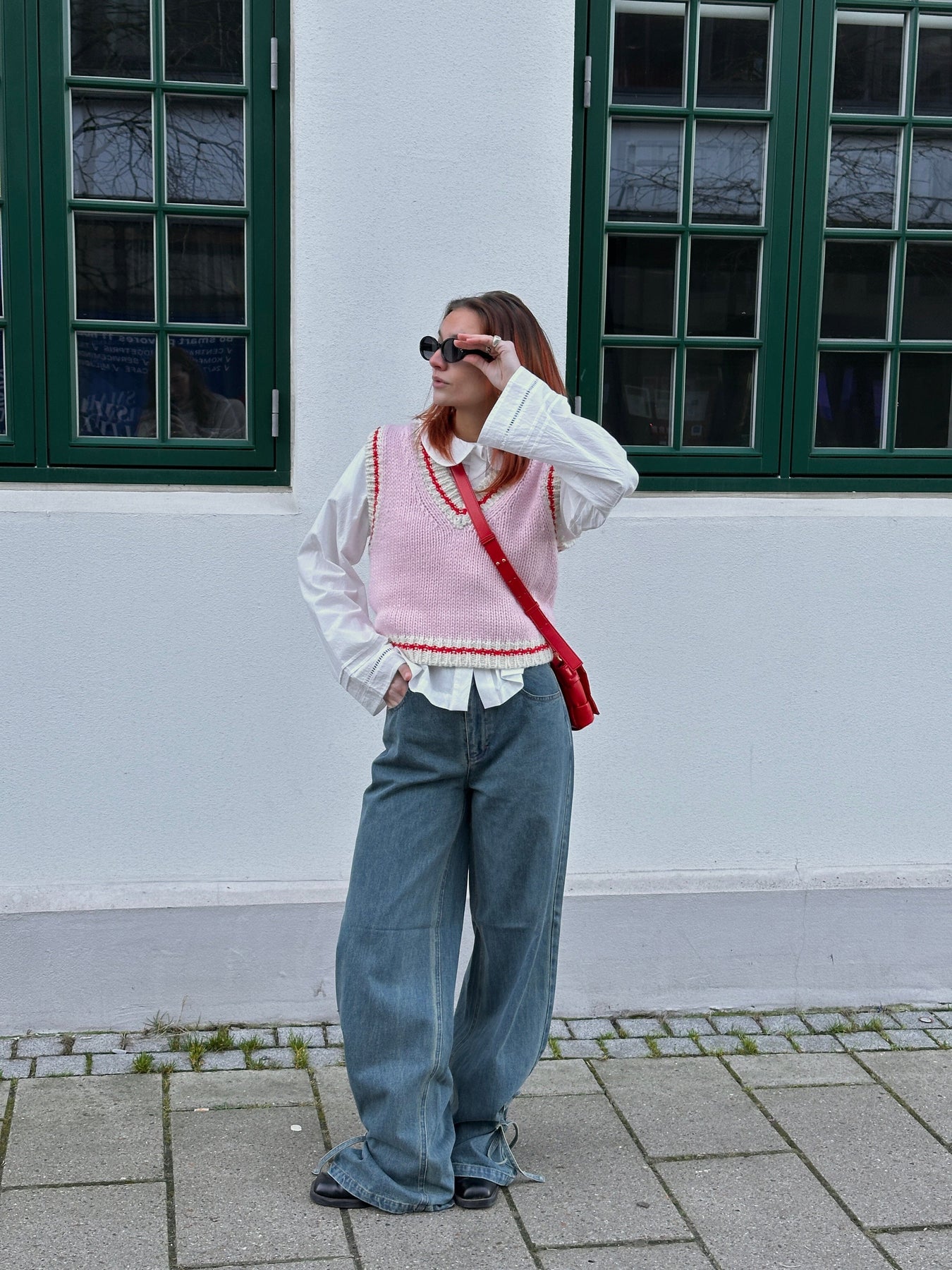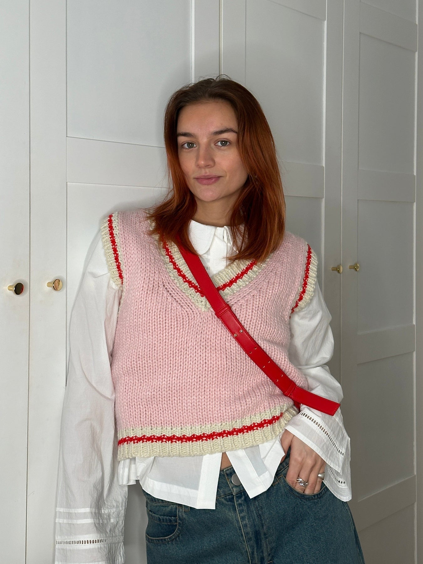 Noellan neuleliivi vaaleanpunaisena ja kermanvärisenä punaisilla raidoilla. Siinä on V-pääntie ja se on ilman hihoja. Liivi on neulottu paksusta langasta raidallisella kuviolla.