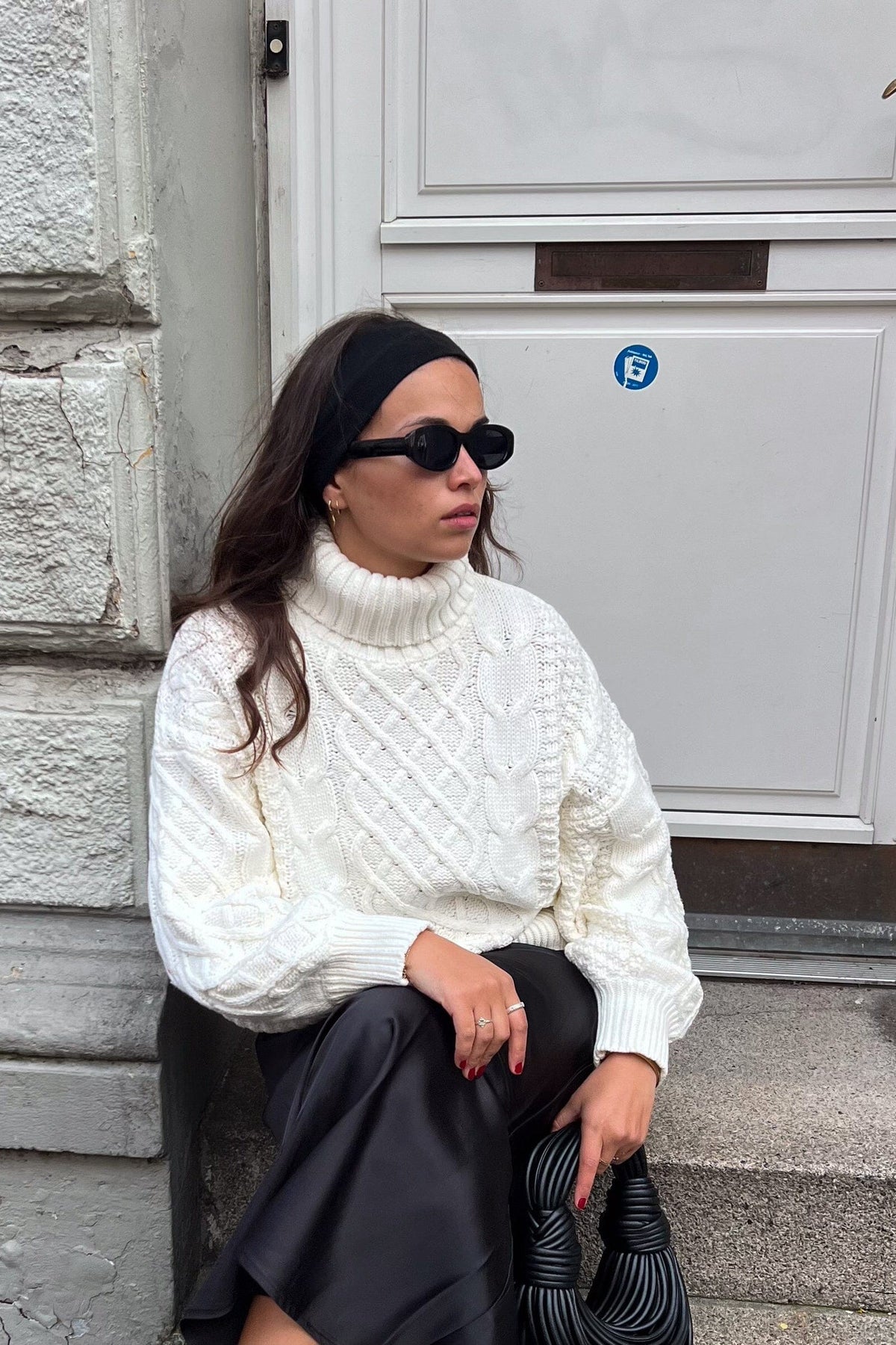 Off-white neulepaita Noellalta, jossa on kaapelikudontayksityiskohtia edessä. Paidassa on korkea poolokaulus ja pitkät hihat, joissa on lettikuvio.