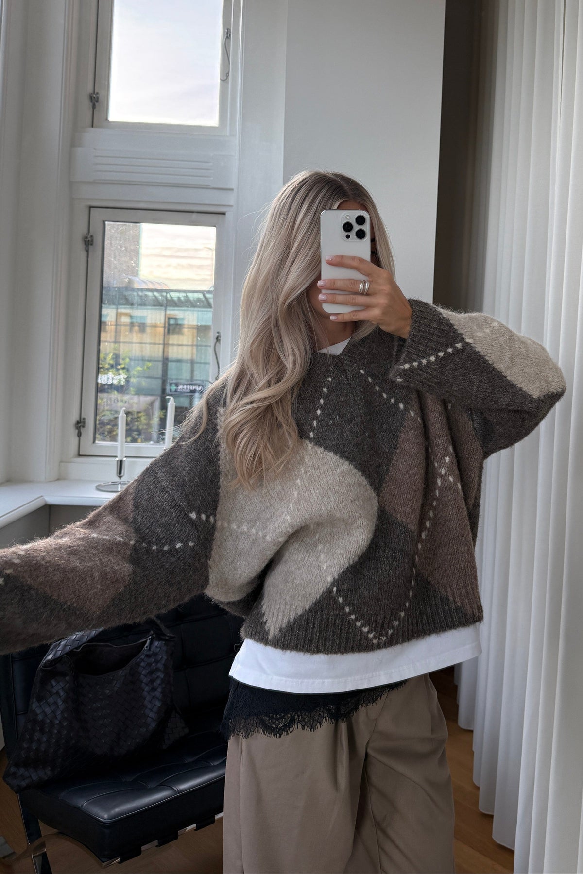 Neule Noellalta ruskeiden ja vaaleanbeigeten sävyjen yhdistelmässä. Neuleessa on klassinen argyle-kuvio ja koristeelliset saumat.
