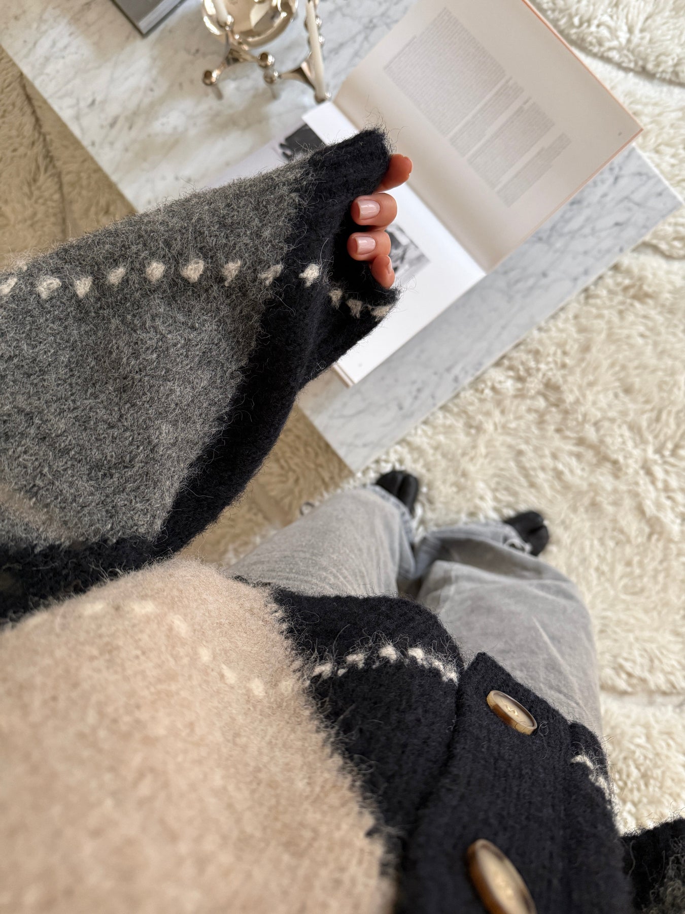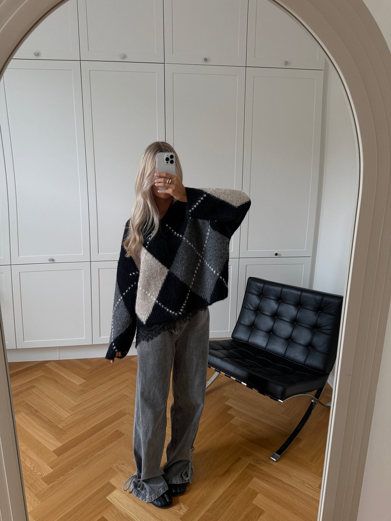 Noellan neulepaita, jossa on suuria timantinmuotoisia kuvioita tummansinisessä, harmaassa ja beigen värissä. Siinä on V-pääntie ja pitkät hihat, joissa on löysä istuvuus.