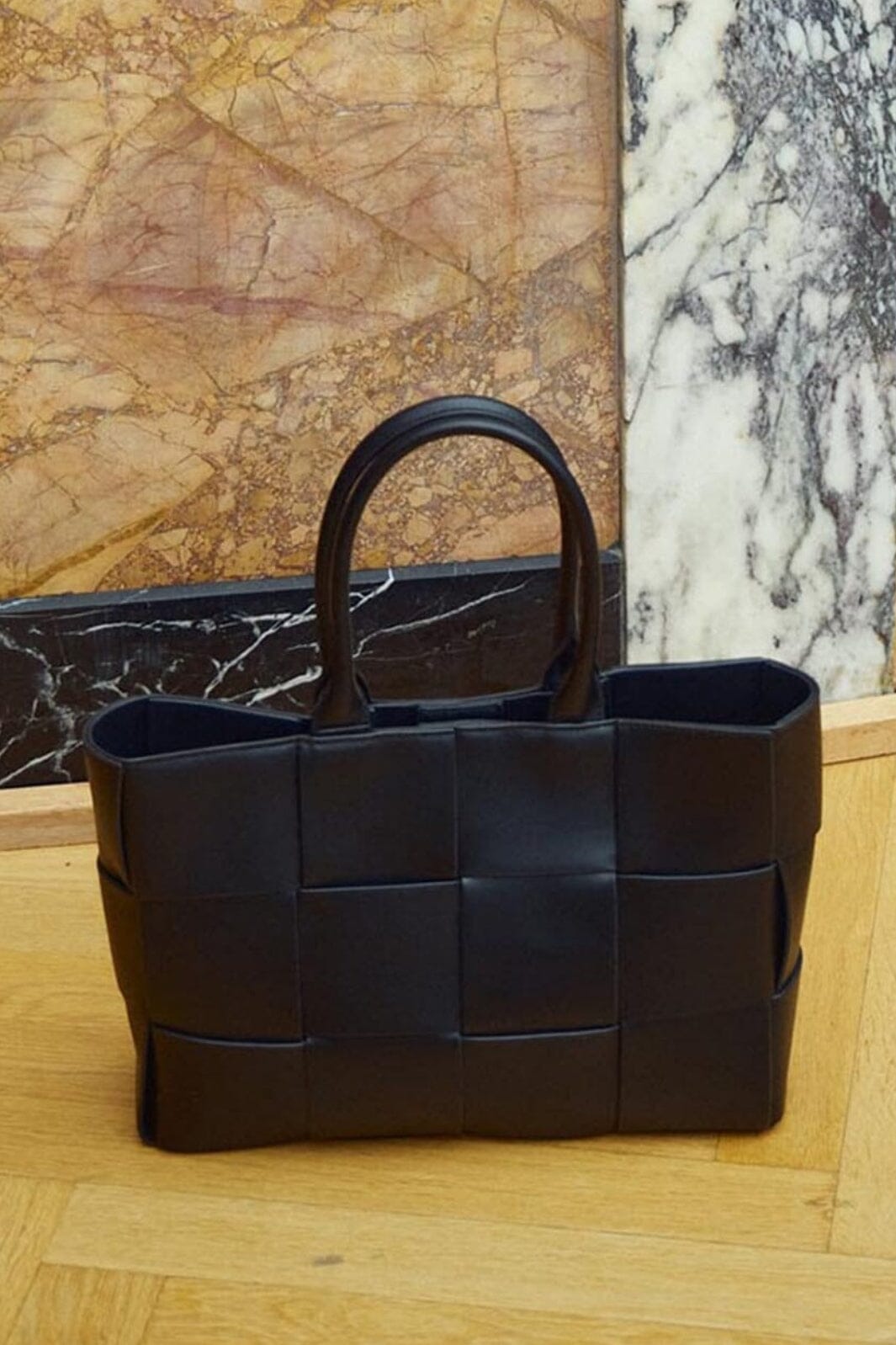 Musta käsilaukku Noellalta kudotulla designilla. Laukku on suorakulmainen ja valmistettu PU-materiaalista, jossa on tyypillinen punottu kuvio, joka antaa pinnalle rakennetta.