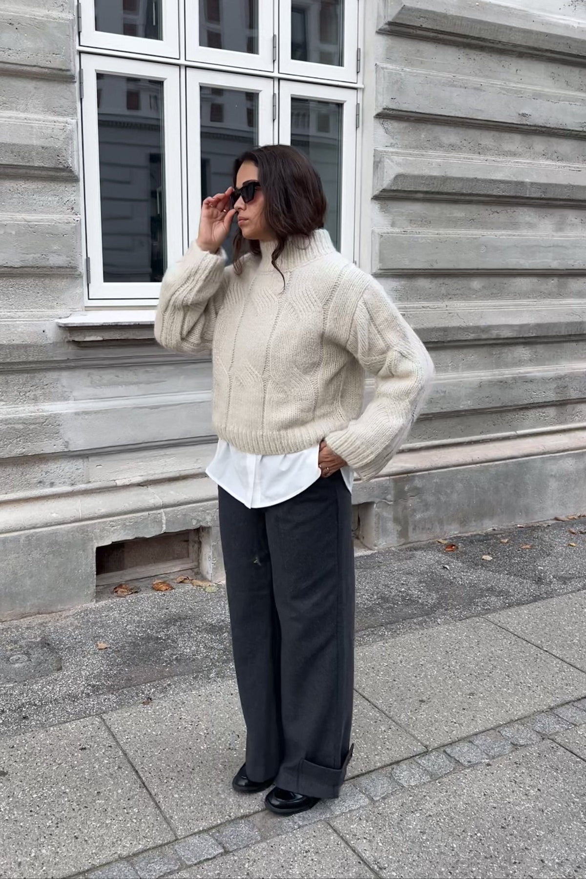 Noellan neulepaita vaaleassa kermavärissä. Paidassa on selkeä palmikkoneulekuvio sekä edessä että takana, ja siinä on korkea kaulus.