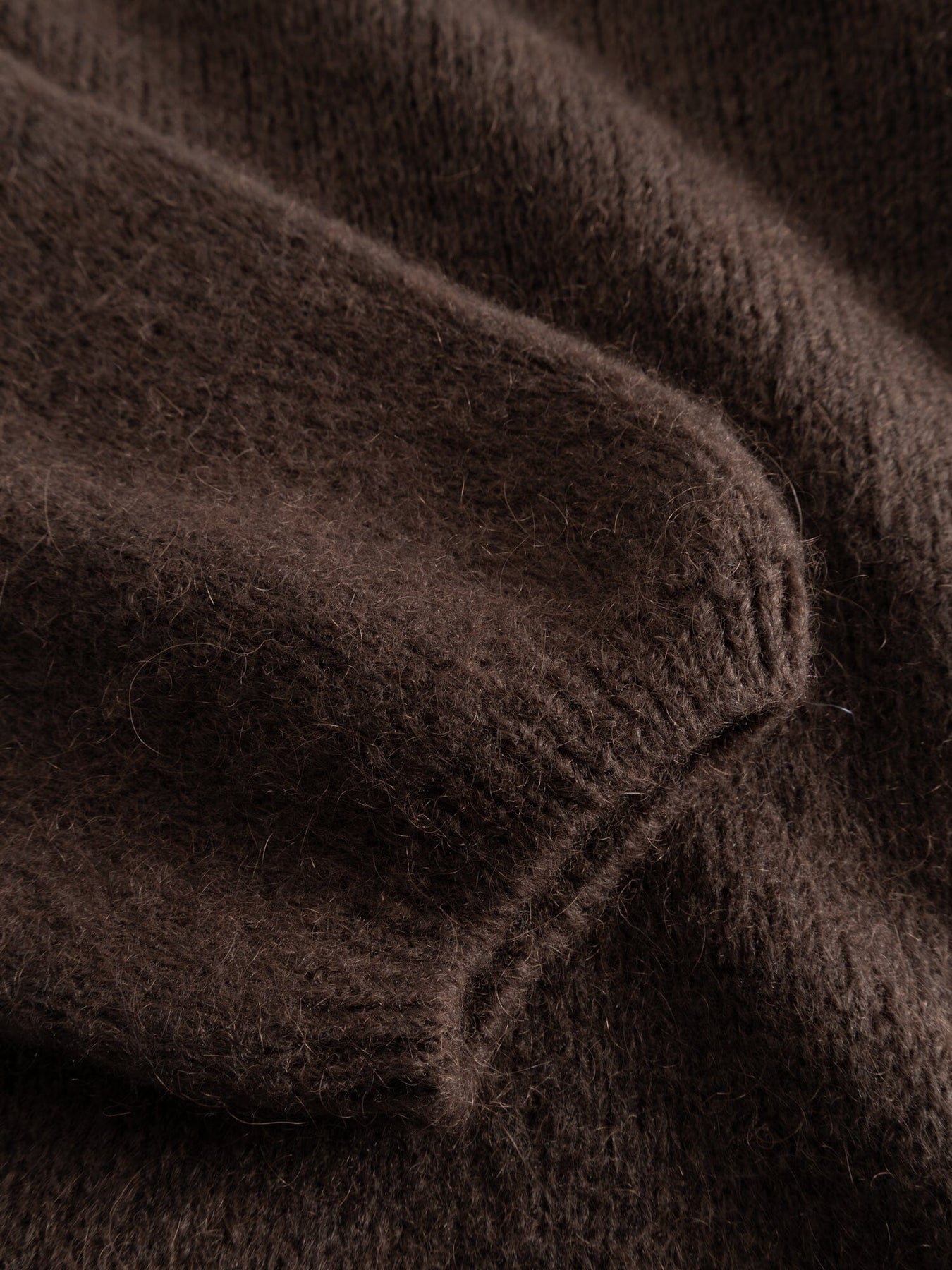 Tummanruskea neulepaita puffihihansuilla ja cropped-muotoilulla. Pehmeässä neuleessa on pyöreä kaula-aukko ja löysä istuvuus, joka tarjoaa hyvää liikkumisvapautta.