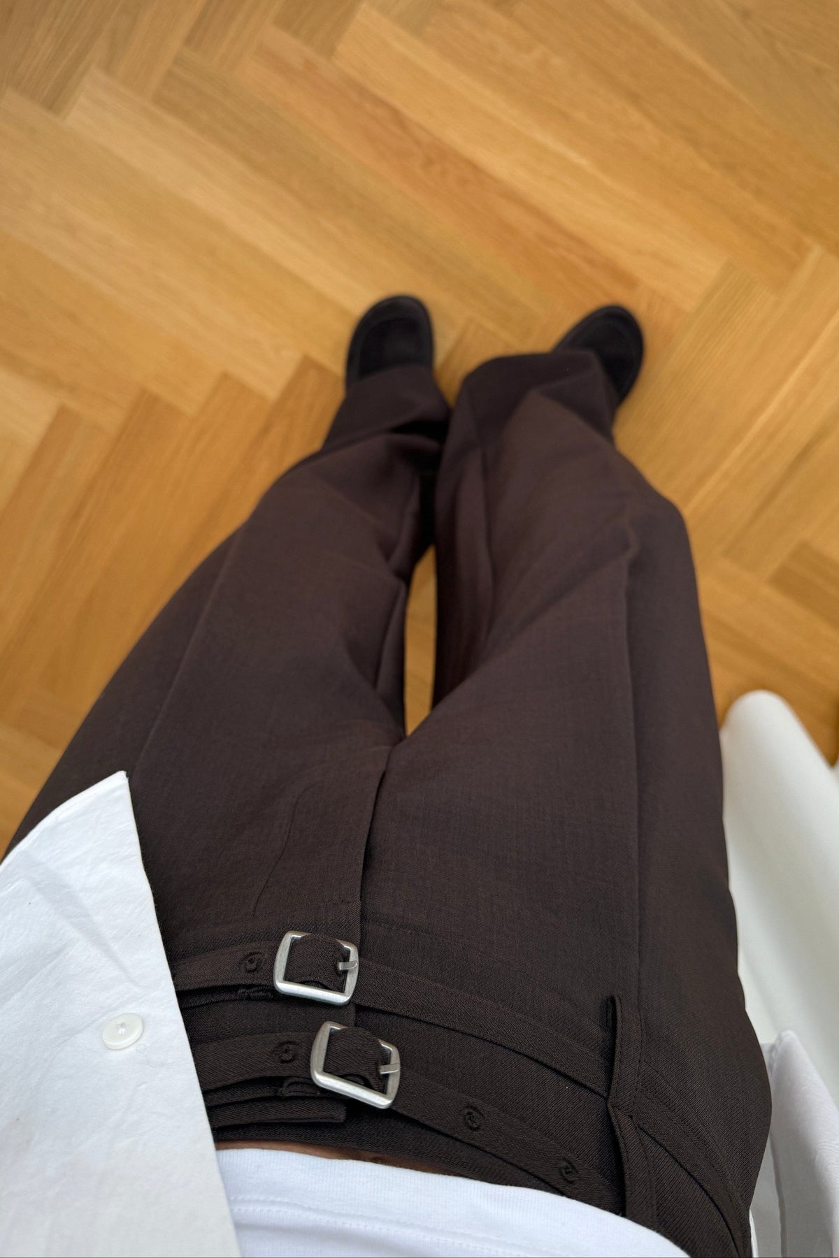 Ruskeat Noella-housut, joissa on korkea vyötärö ja leveät lahkeet. Housuissa on väljä istuvuus ja ne ulottuvat lattiaan asti.