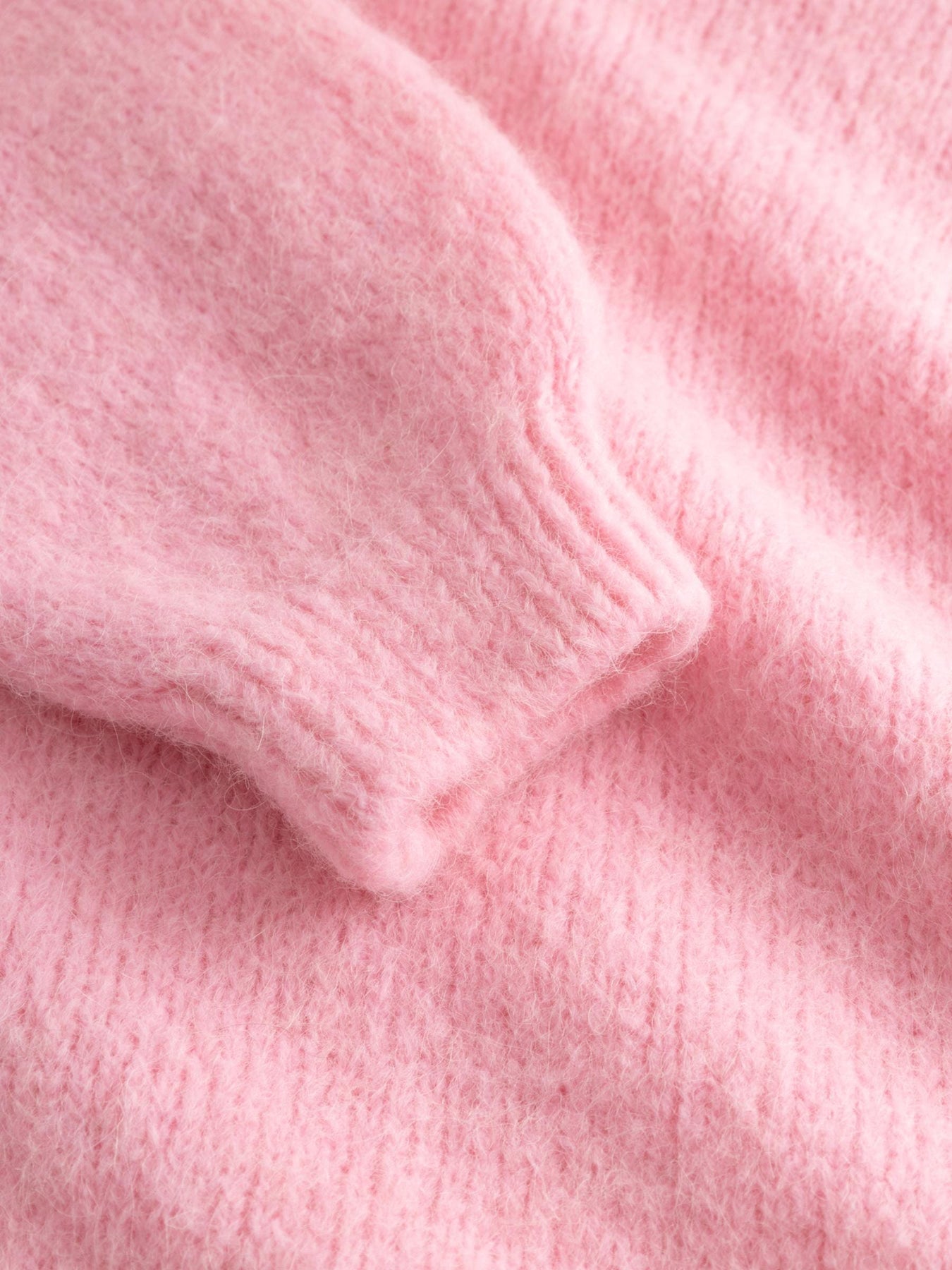Vaaleanpunainen neulepusero Noellalta, jossa on väljä istuvuus. Pusero on valmistettu pehmeästä sekoitteesta ja sopii sekä rentoihin päiviin kotona että arkikäyttöön.