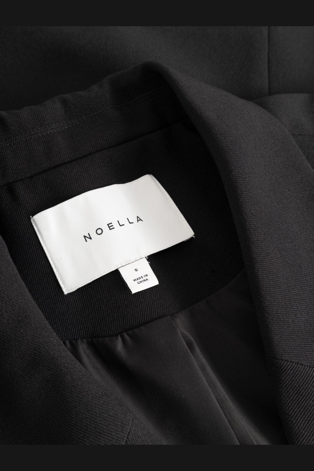 Musta cropped-bleiseri Noellalta, jossa on paitakaulus ja nappikiinnitys. Bleiserissä on lyhyet hihat ja oversized-istuvuus.