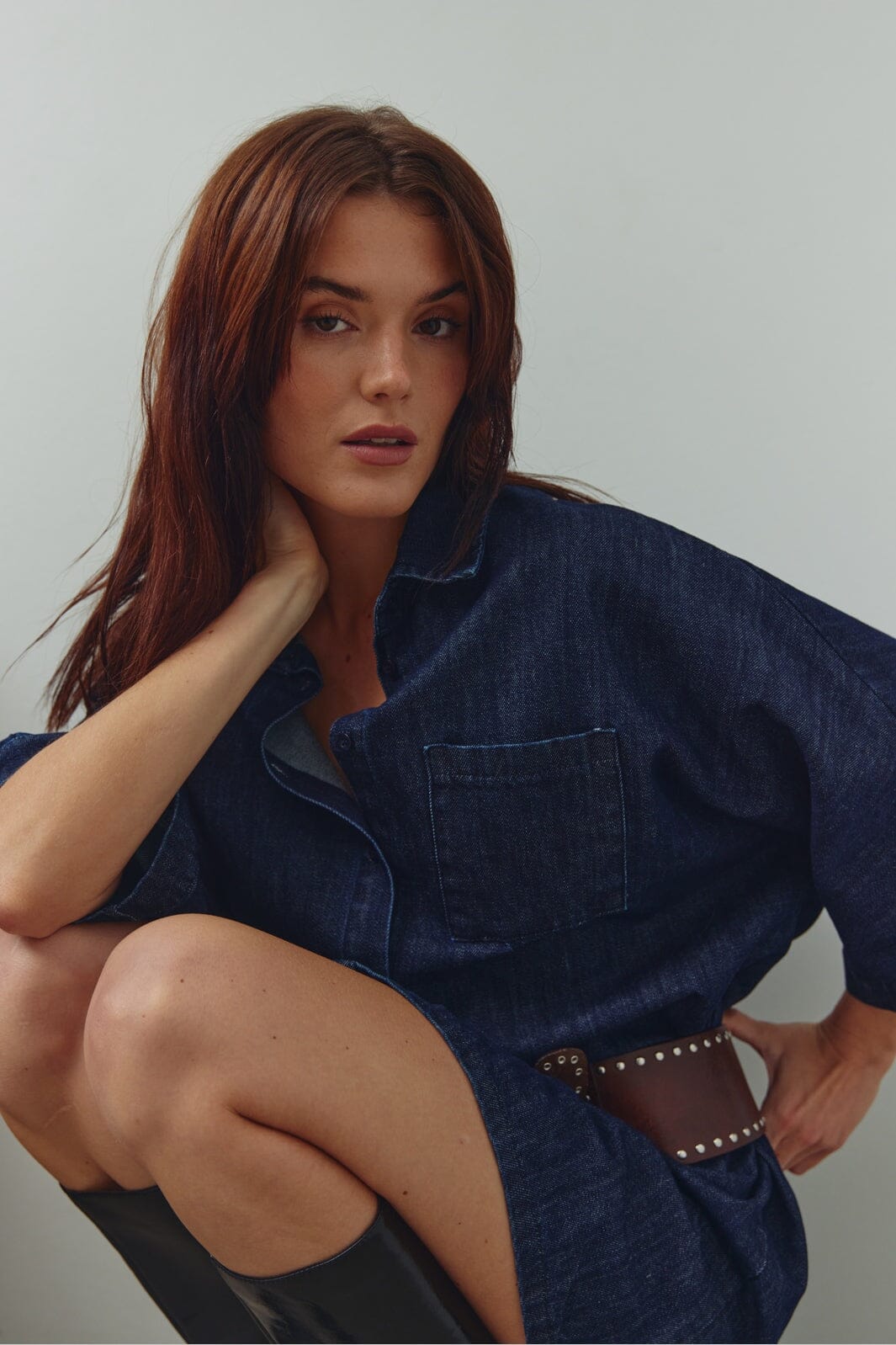Sininen denimmekko Noellalta, valmistettu 100 % puuvillasta. Mekossa on väljä istuvuus, lyhyet hihat ja klassinen kaulus nappikiinnityksellä edessä.