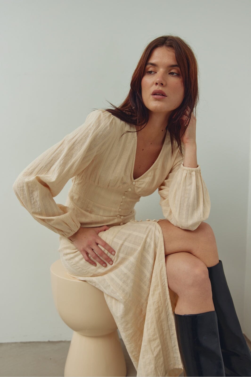 Pitkä Noella-mekko luonnonvalkoista puuvillaa, V-pääntiellä, pitkissä hihoissa ja napeilla keskellä edessä. Sopii sekä arkeen että juhlavampiin tilaisuuksiin.