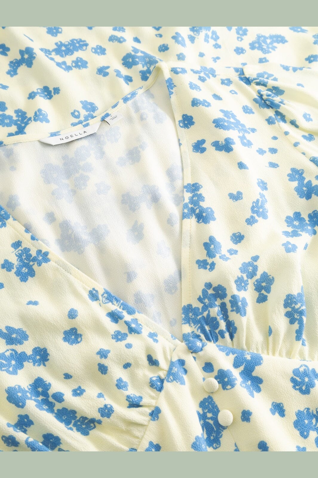Noellan maksimekko keltaisena, sinisellä kukkaprintillä. Mekossa on syvä V-pääntie, pitkät hihat ja pituus ulottuu nilkkoihin.