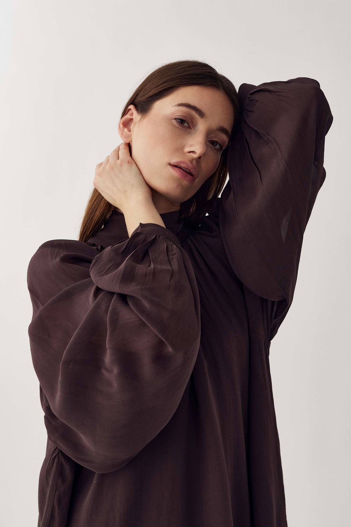 Suklaanruskea mekko Noellalta, valmistettu 100 % viskoosista. Mekossa on korkea pääntie rusetilla ja pitkät hihat, joissa on joustavat hihansuut.