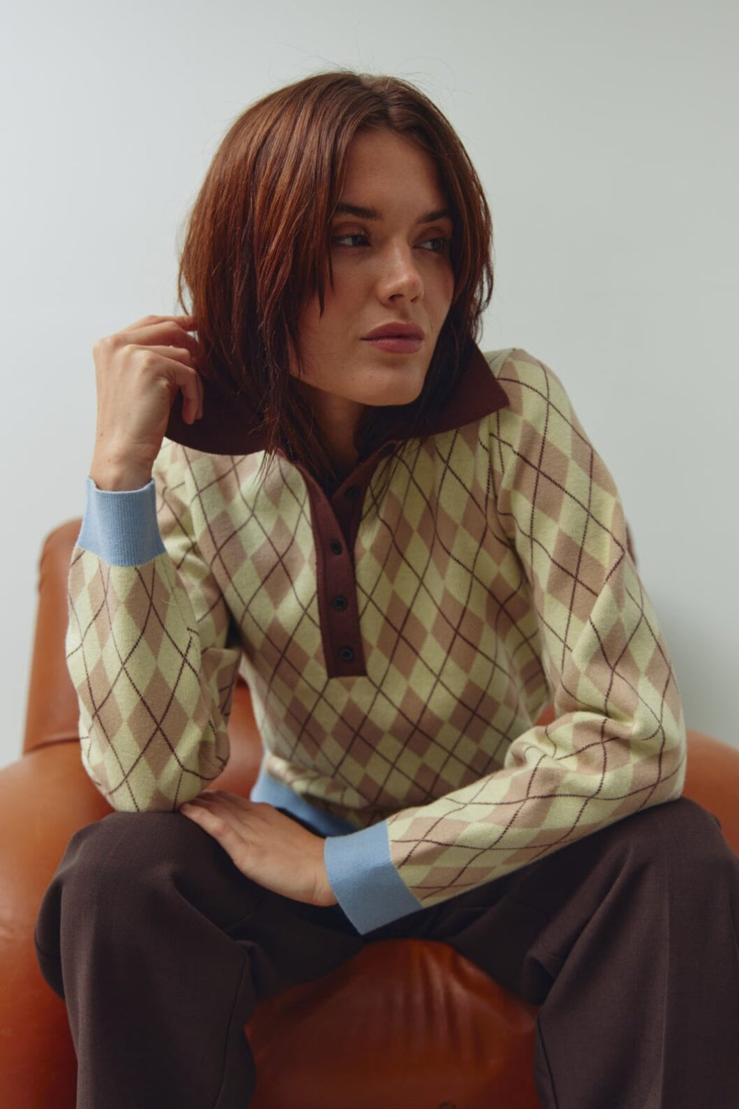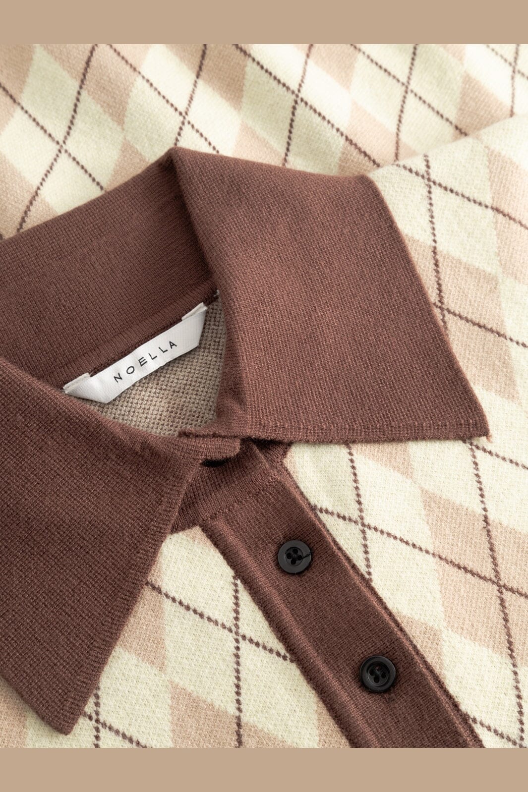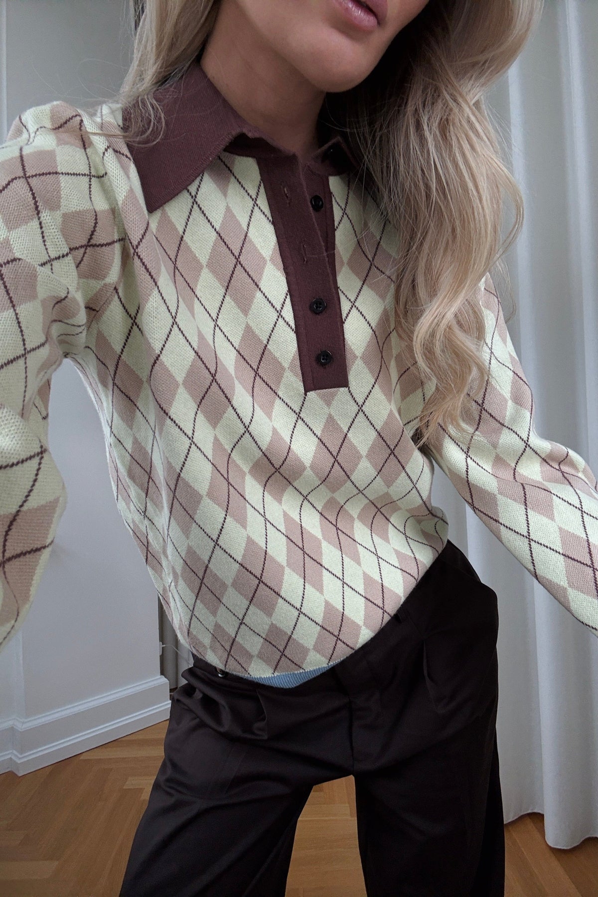 Noellan neulepusero keltaisesta ja ruskeasta ruudullisesta intarsiakudoksesta. Neuleessa on ruskea poolokaulus, pitkät hihat vaaleansinisillä hihansuilla ja slim fit -mitoitus.