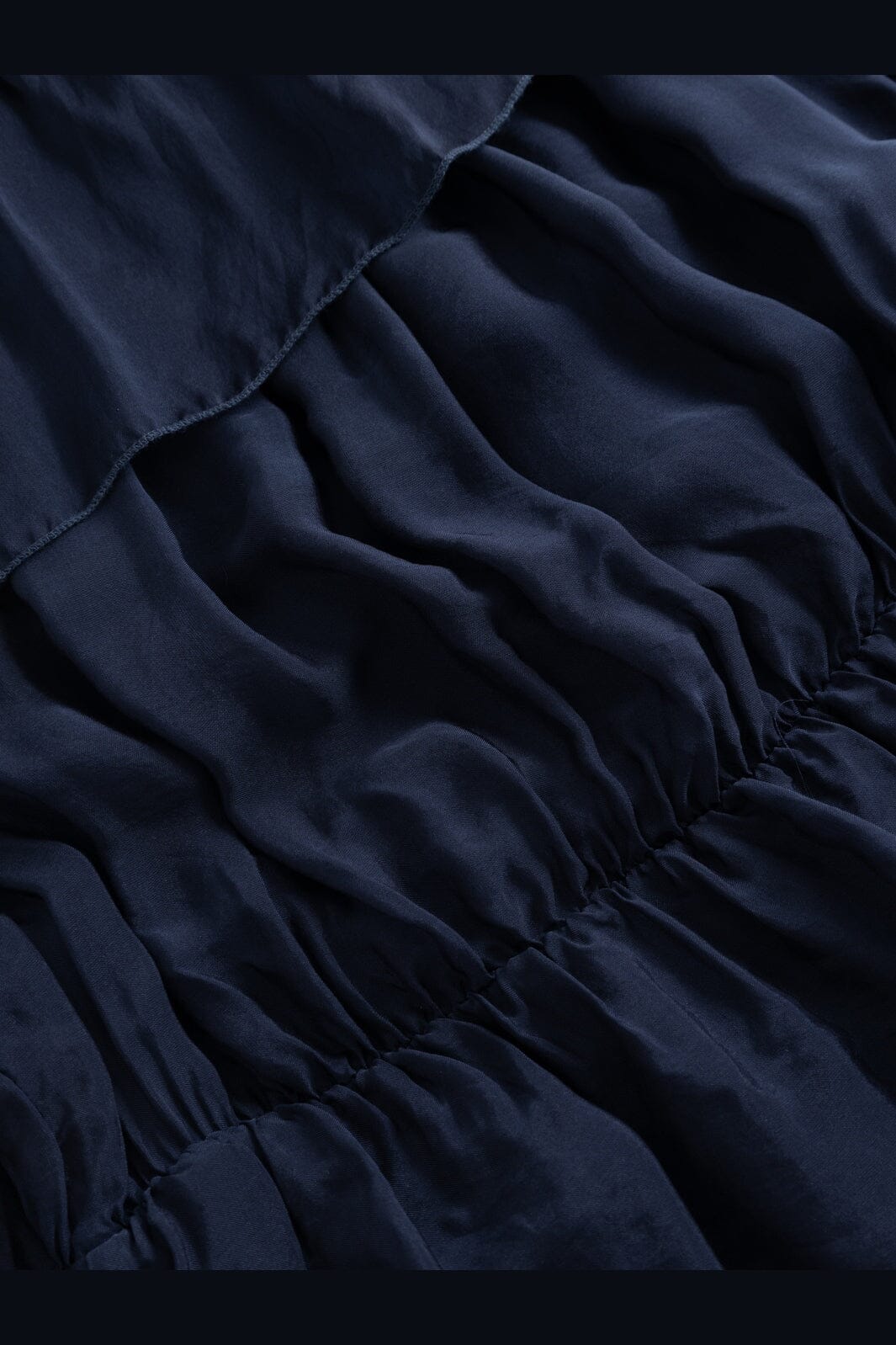 Tummansininen pusero Noellalta, valmistettu 70 % viskoosista ja 30 % silkistä. Puserossa on kerrokselliset röyhelöt ja avoin, joustava pääntie.