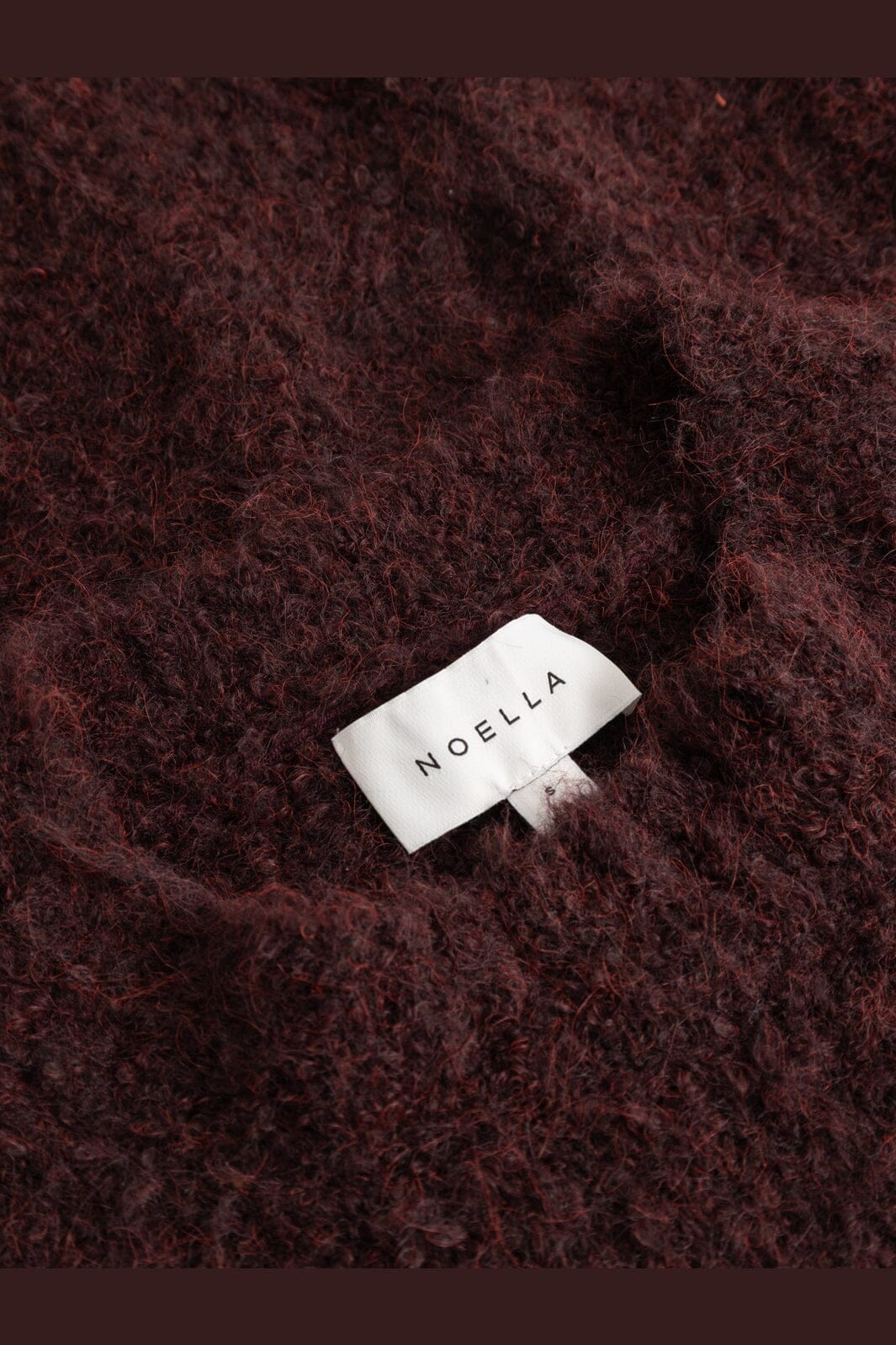 Neulepusero Noellalta, valmistettu bukleelangasta syvän viininpunaisessa sävyssä. Puserossa on pehmeä ja pörröinen rakenne.