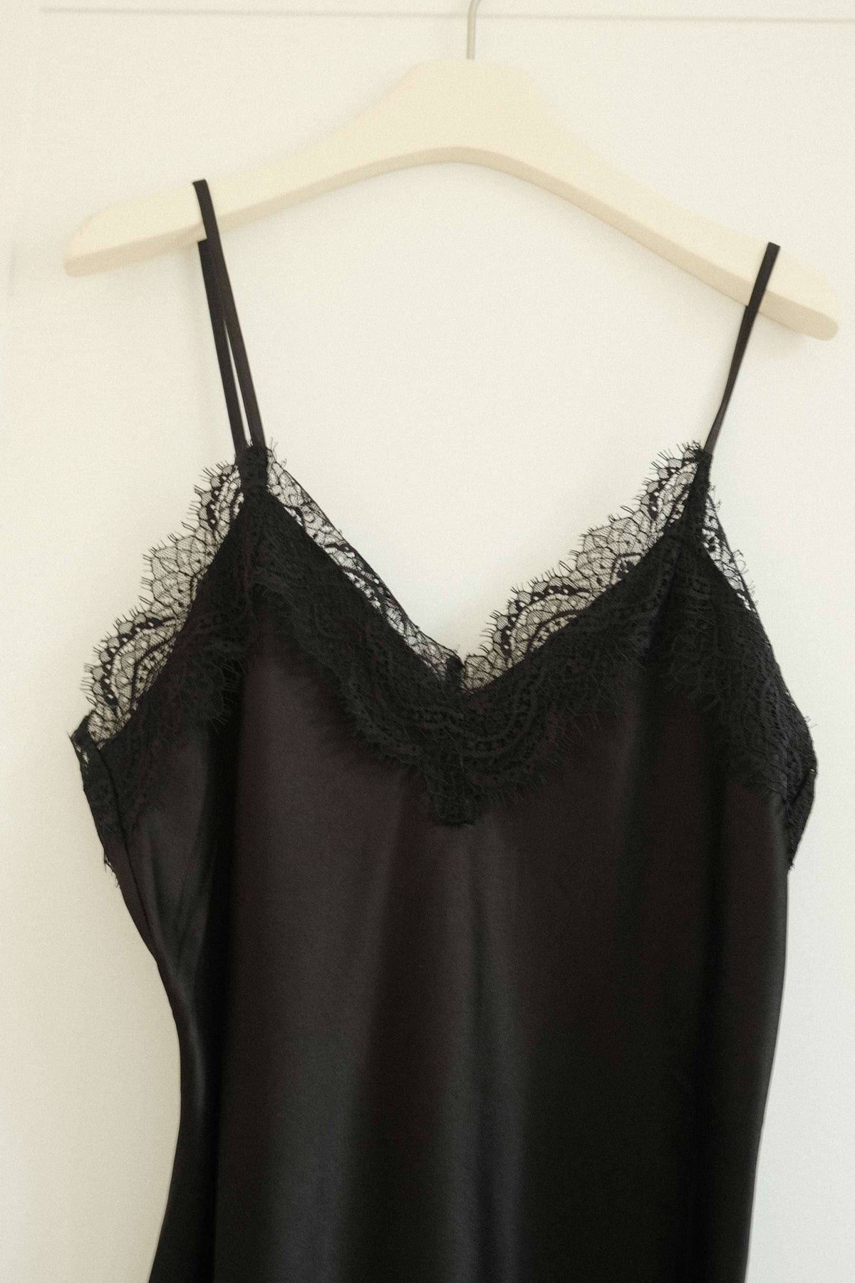 Musta satiinimekko Noellalta. Mekossa on ohuet säädettävät olkaimet, pitsiyksityiskohtia ja epäsymmetrinen helma, joka ulottuu polveen.