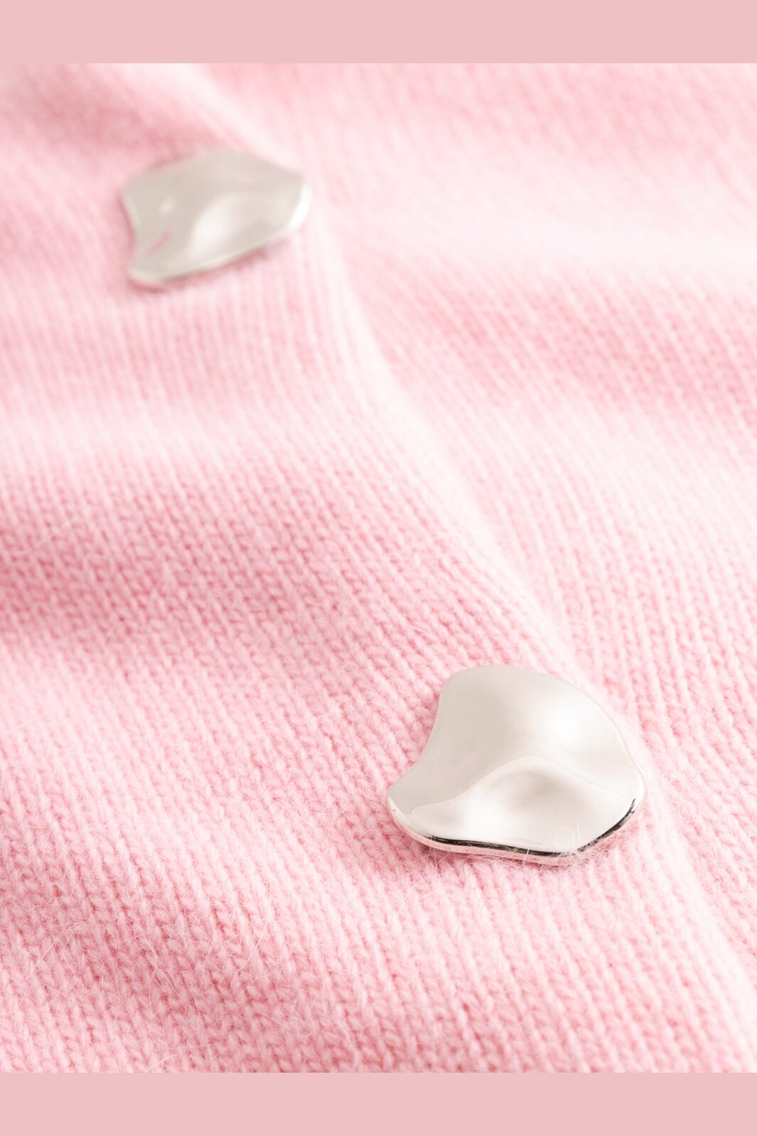 Neulecardigan Noellalta vaaleanpunaisena (baby pink). Valmistettu 70 % nylonista ja 30 % angorasta, mikä antaa pehmeän ja lämpimän tuntuman.