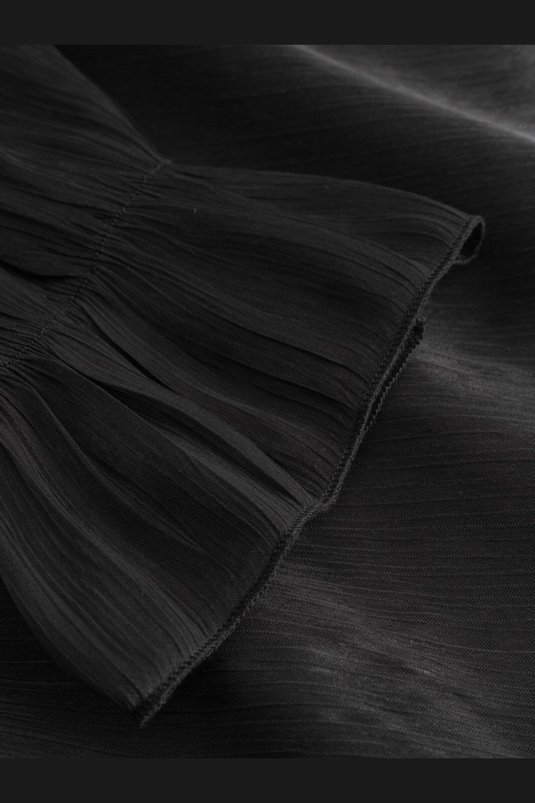 Musta Noella-pusero, jossa off-shoulder-malli ja ohuet olkaimet. Puserossa on pitkät hihat, joissa on joustavat hihansuut, sekä suuri röyhelö rinnan kohdalla.