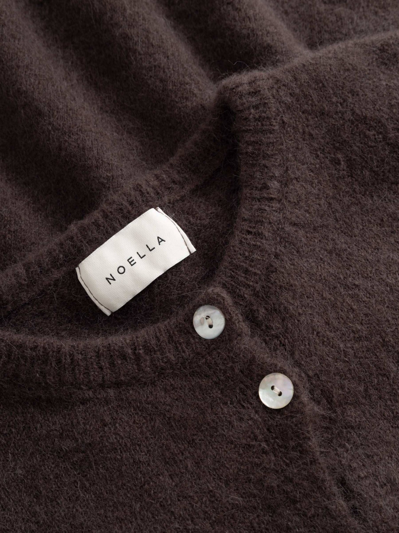 Neulottu neuletakki Noellalta suklaanruskeana. Neuletakissa on väljä istuvuus, nappikiinnitys edessä ja pyöreä pääntie sekä pitkät hihat.