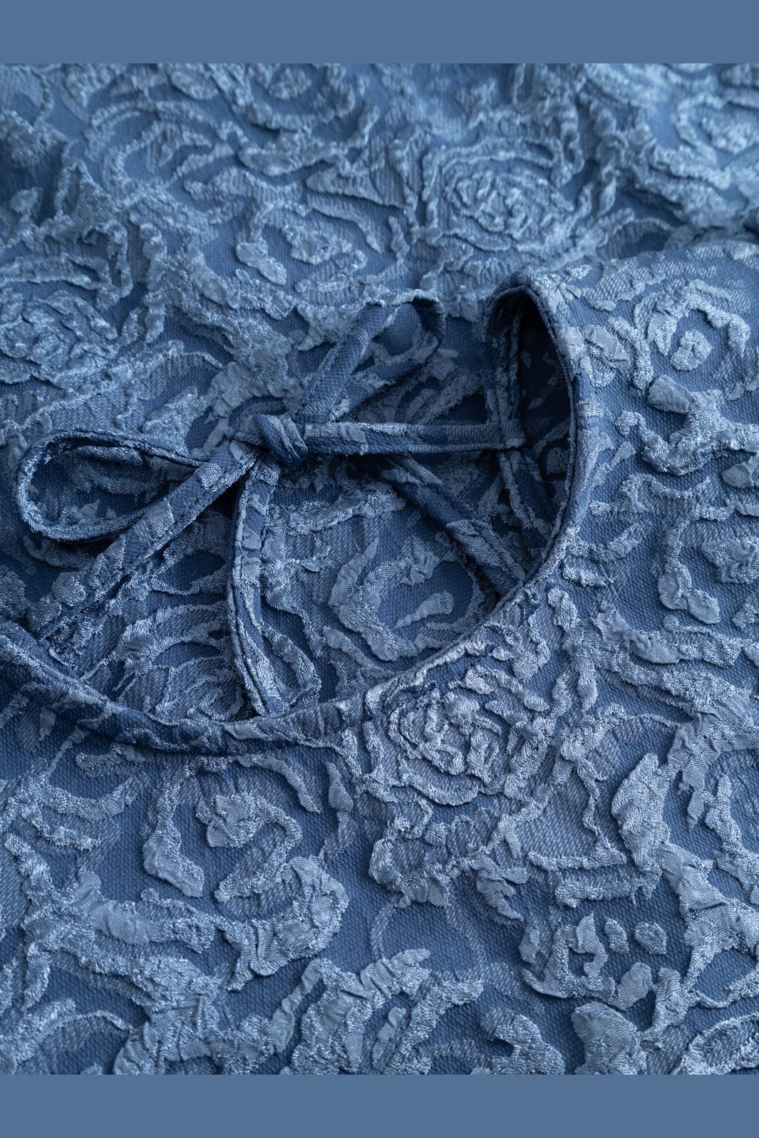 Pitkä Noella-mekko harmaan sinisessä sävyssä ja kukkakuosilla. Mekko on valmistettu jacquard-kankaasta, jonka rakenne antaa kankaalle syvyyttä.