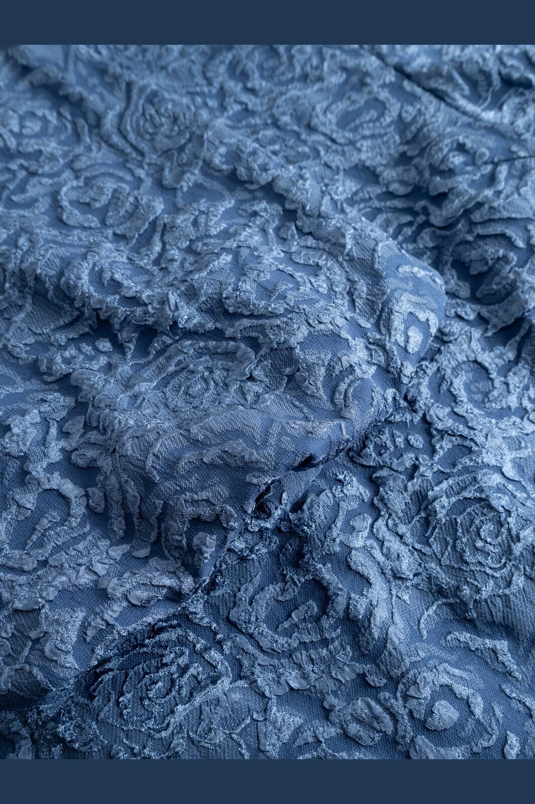 Noellan pusero harmaan sinisessä sävyssä, jossa on kohokuvioitu kukkakuvio. Puserossa on leveät hihat ja väljä istuvuus.
