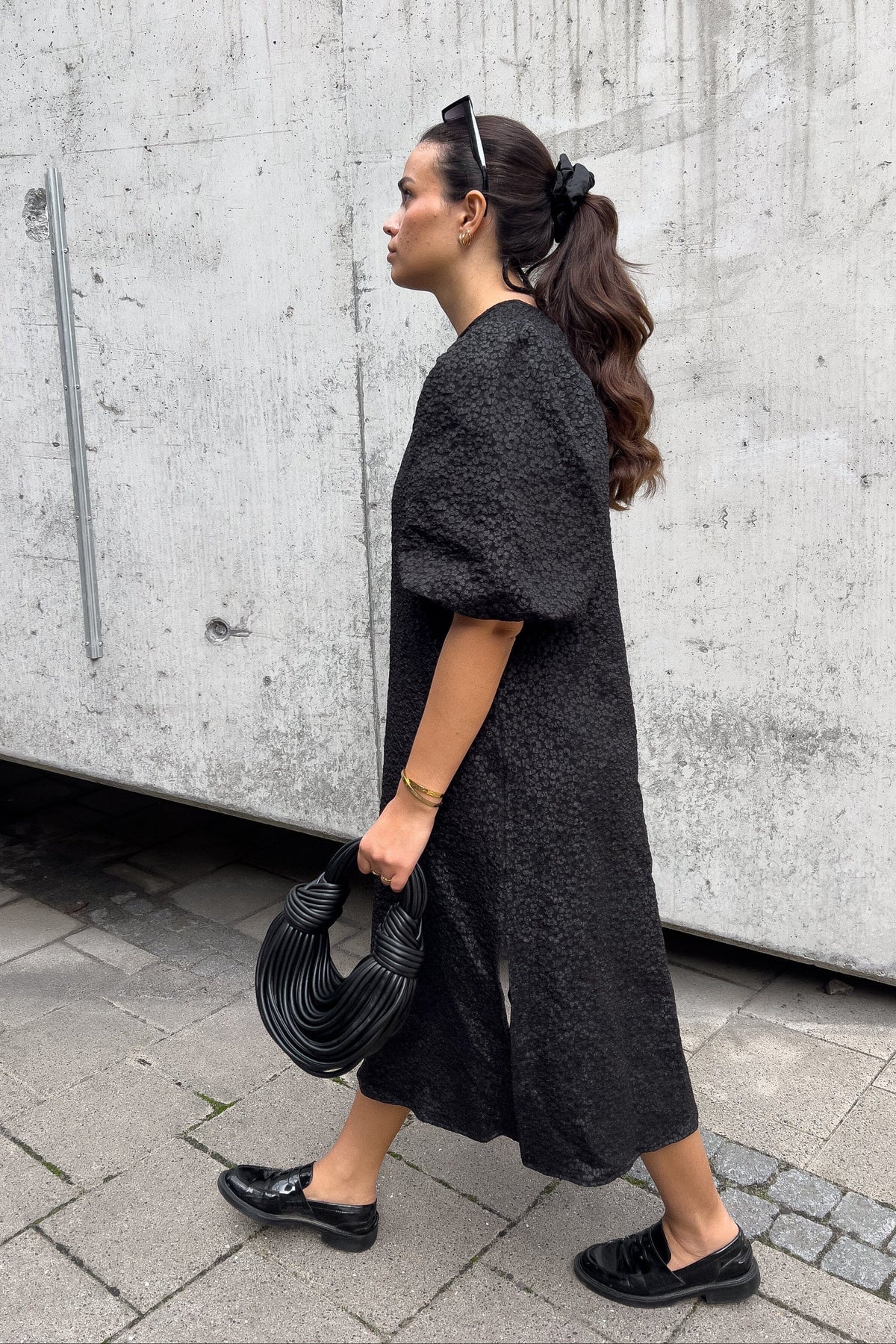 Musta pitkä mekko Noellalta kukkakuosisella tekstuurilla. Mekossa on puffihihat ja nauhakiinnitys selässä, sekä V-pääntie ja kaunis laskos säären keskelle.