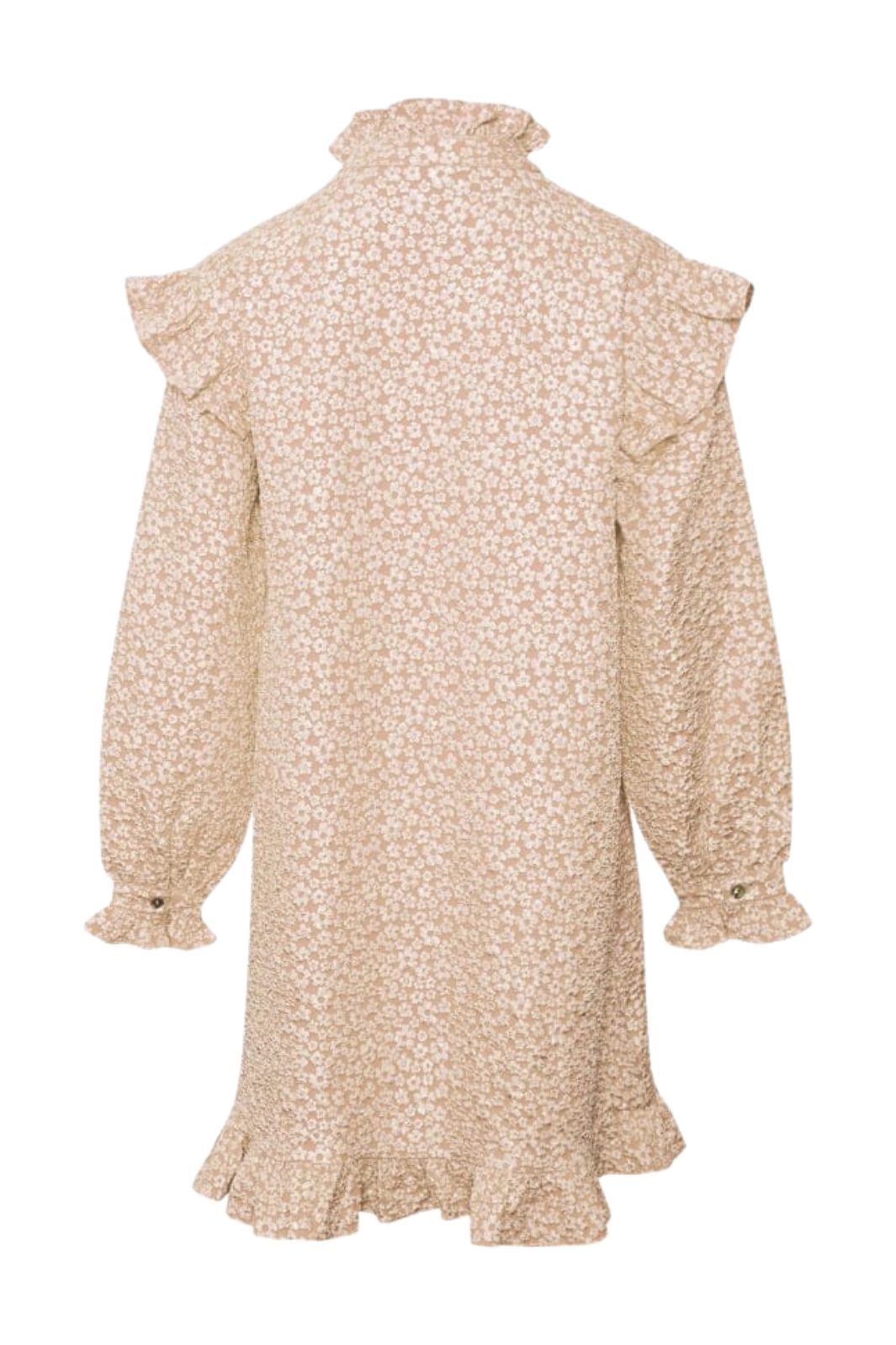 Noellan mekko vaaleassa osterinvärissä kukkakuviolla. Siinä on korkea kaulus röyhelöillä, napit edessä ja pitkät hihat röyhelöreunoilla. Mekko päättyy röyhelöreunukseen alhaalla.