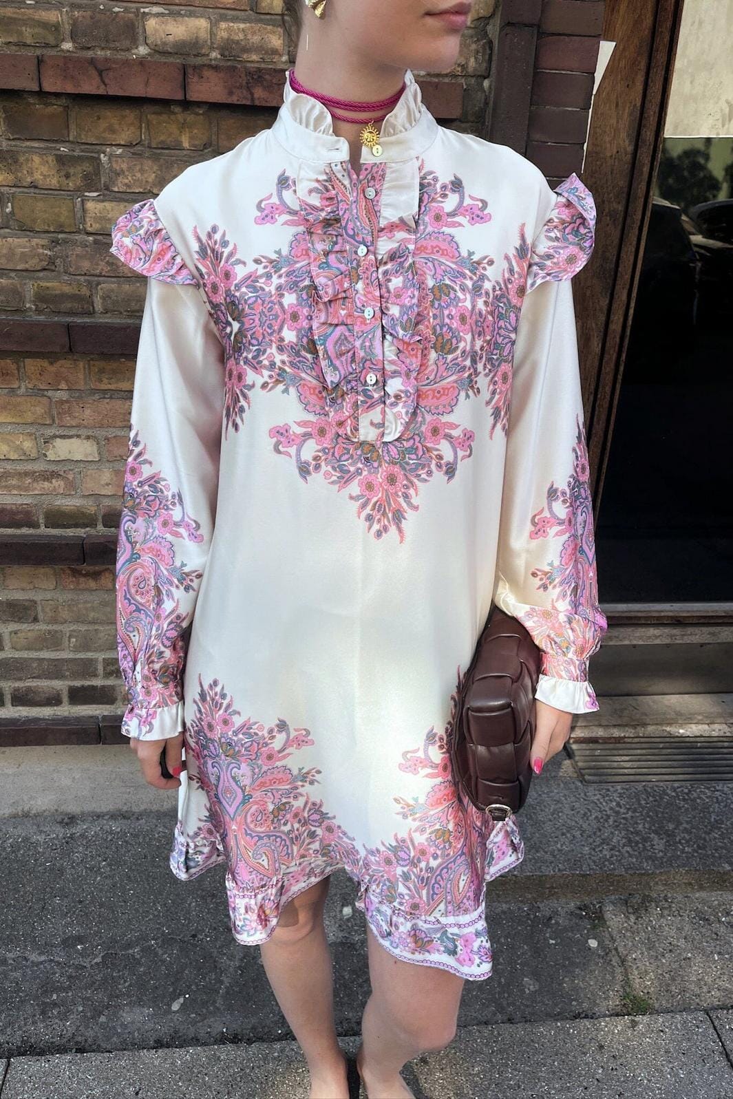 Lyhyt mekko Noellalta kukkakuosilla vaaleissa ja tummissa sävyissä. Mekossa on korkea kaulus röyhelöillä, pitkät hihat ja napit edessä. Kuosi yhdistää vaaleanpunaisen ja sinisen vaalealla taustalla.