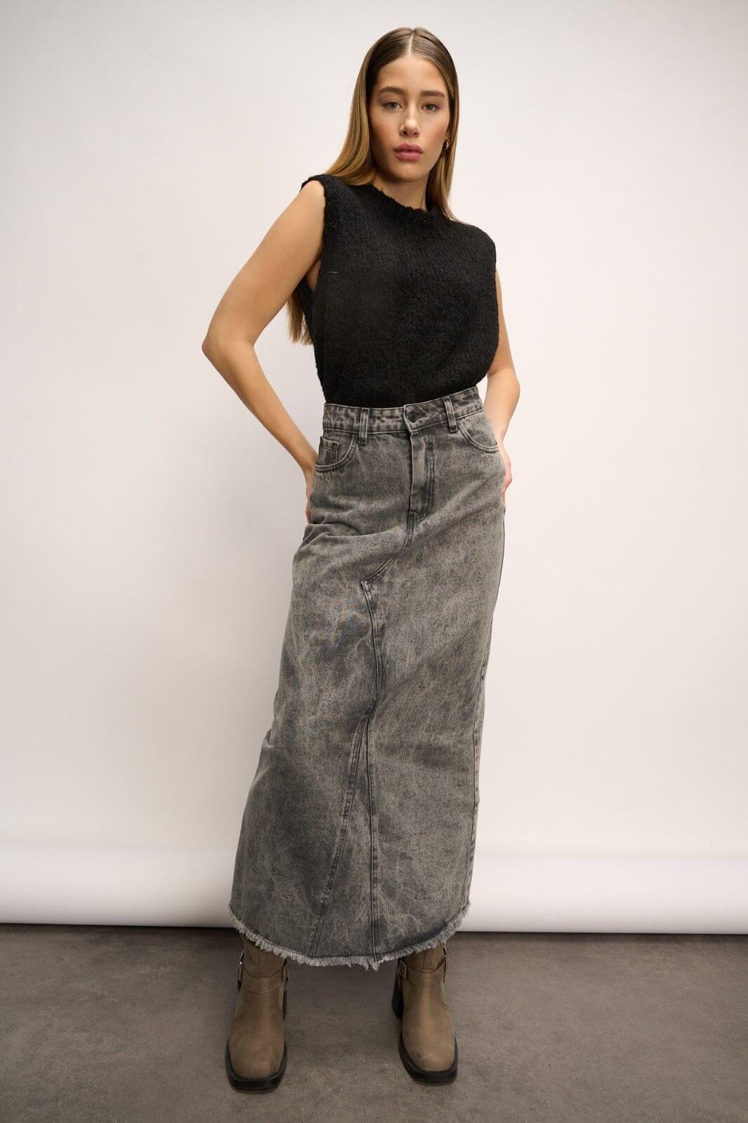 Pitkä farkkuhame harmaaksi pestystä denimistä, jossa on hapsureuna alareunassa. Hameessa on säännöllinen vyötärö ja nilkkapituus, jossa on 5-taskuinen muotoilu ja vetoketjusuljenta.