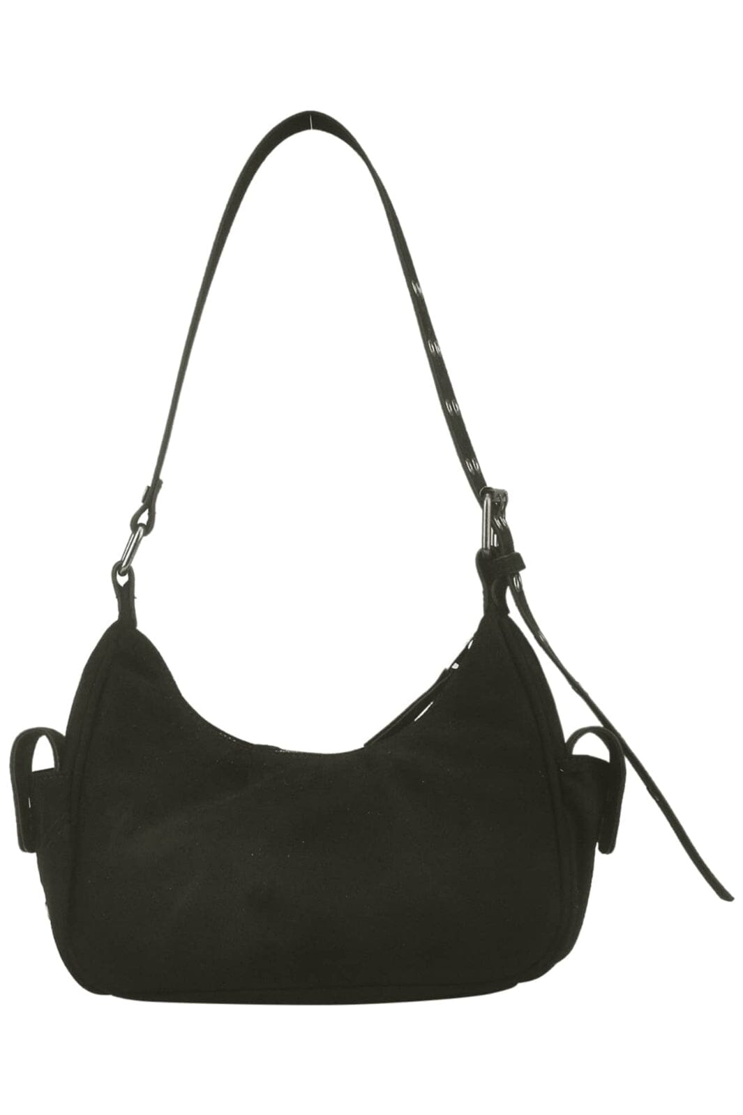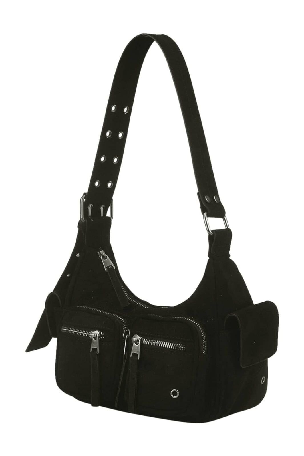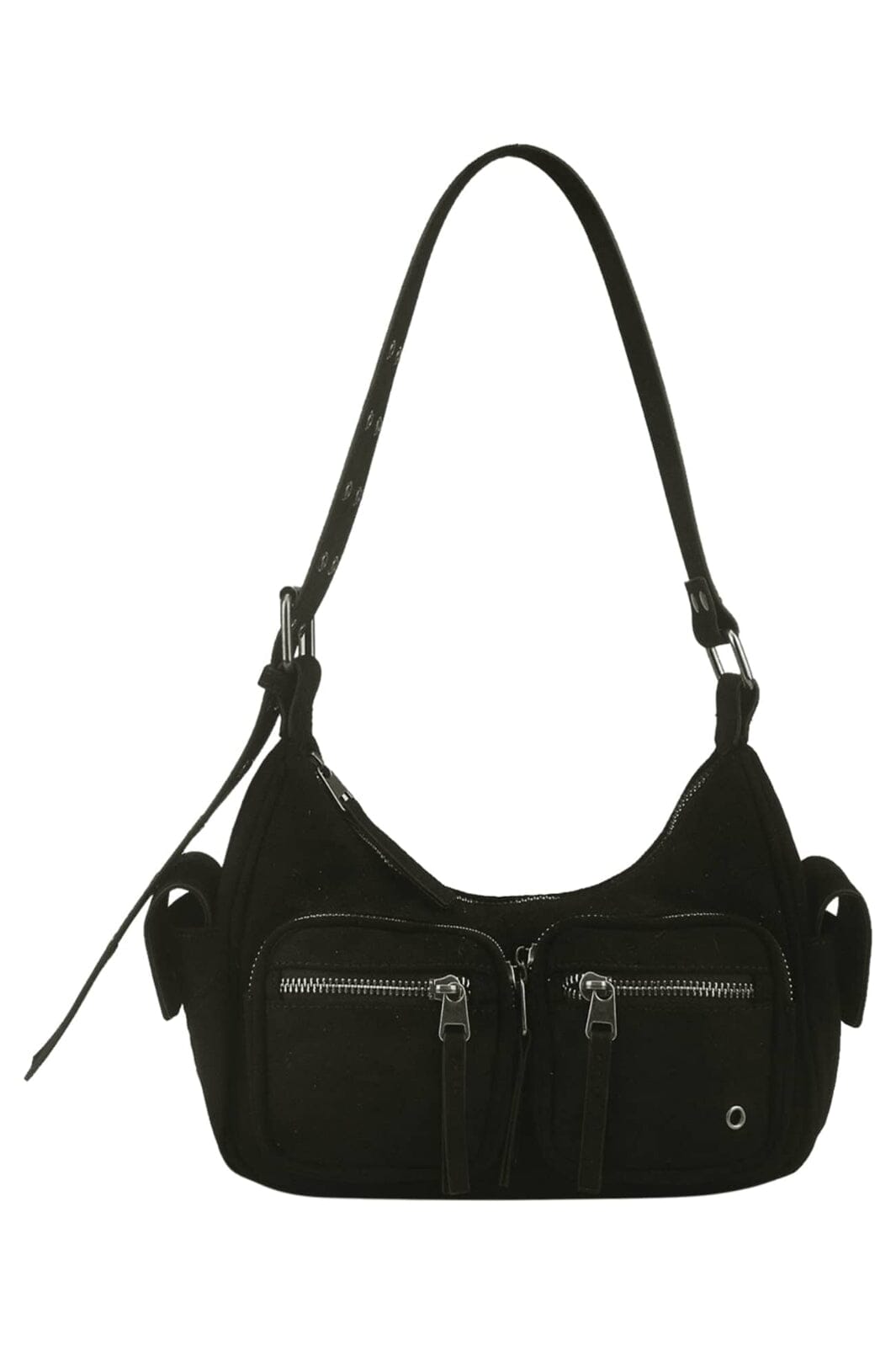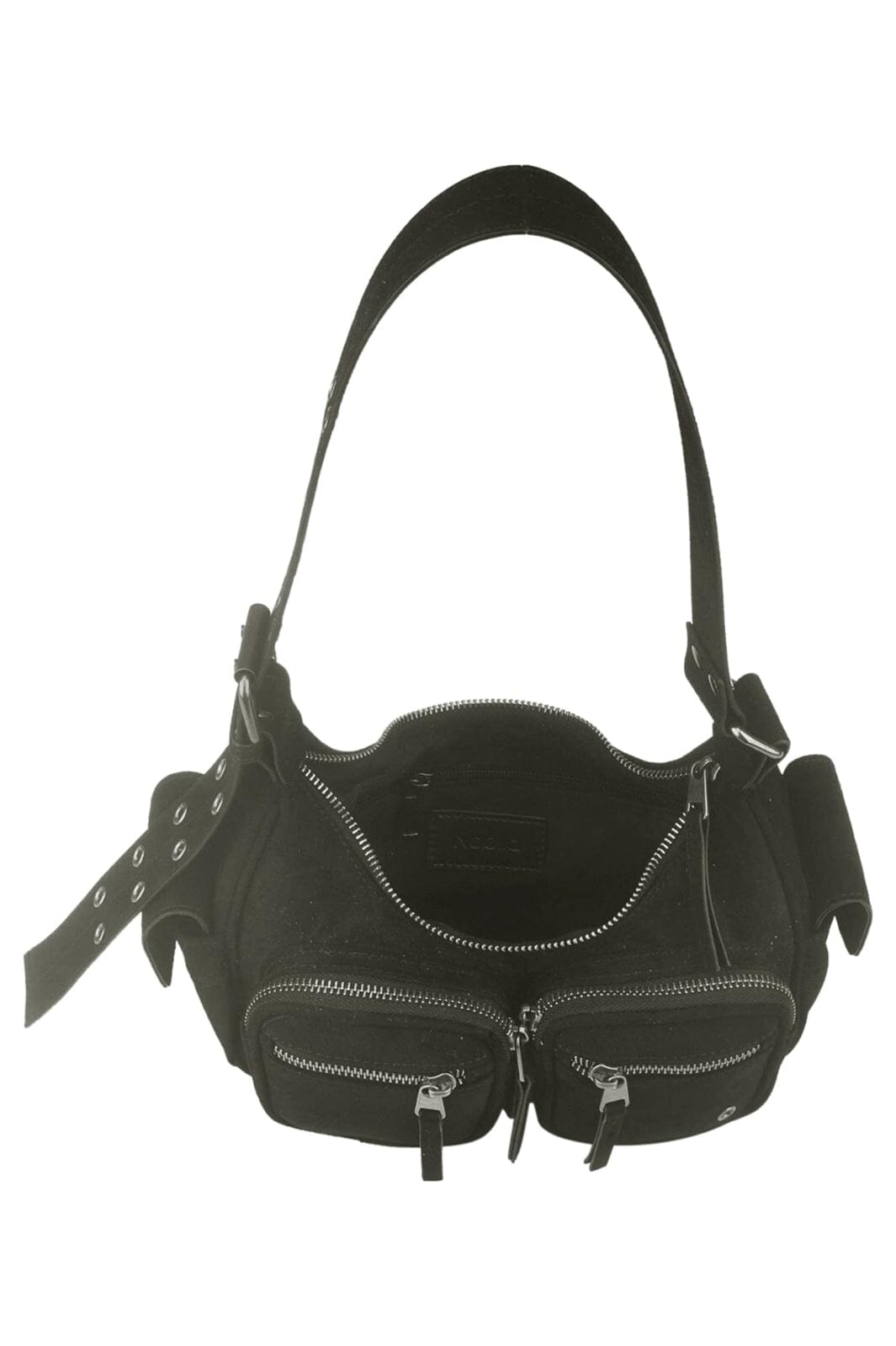 Musta laukku Noellalta käytännöllisillä vetoketjullisilla taskuilla edessä. Laukussa on säädettävä olkahihna ja se on valmistettu kestävästä materiaalista yksinkertaisella designilla.