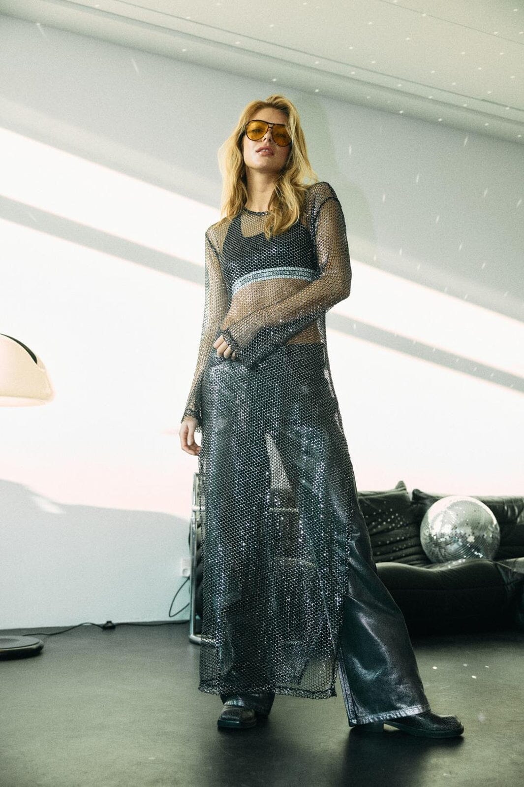 Noisy Mayn farkut keskisinisessä denimissä hopeapinnoitteella. Kiiltävä pinta yhdistää happopesuefektin metalliseen hohteen, joka antaa housuille niiden erityisen luonteen.