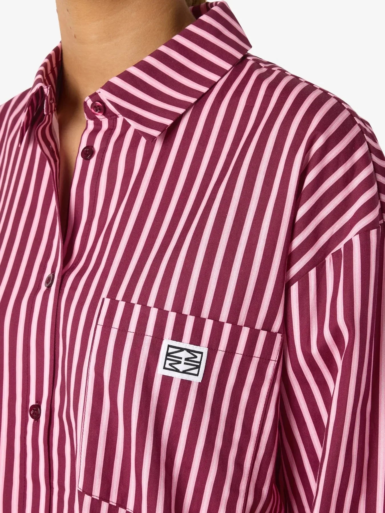 Raidallinen paita Noisy Maylta, valmistettu 57 % polyesteristä ja 43 % puuvillasta. Kuvio yhdistää ruskeita ja vaaleanpunaisia raitoja.
