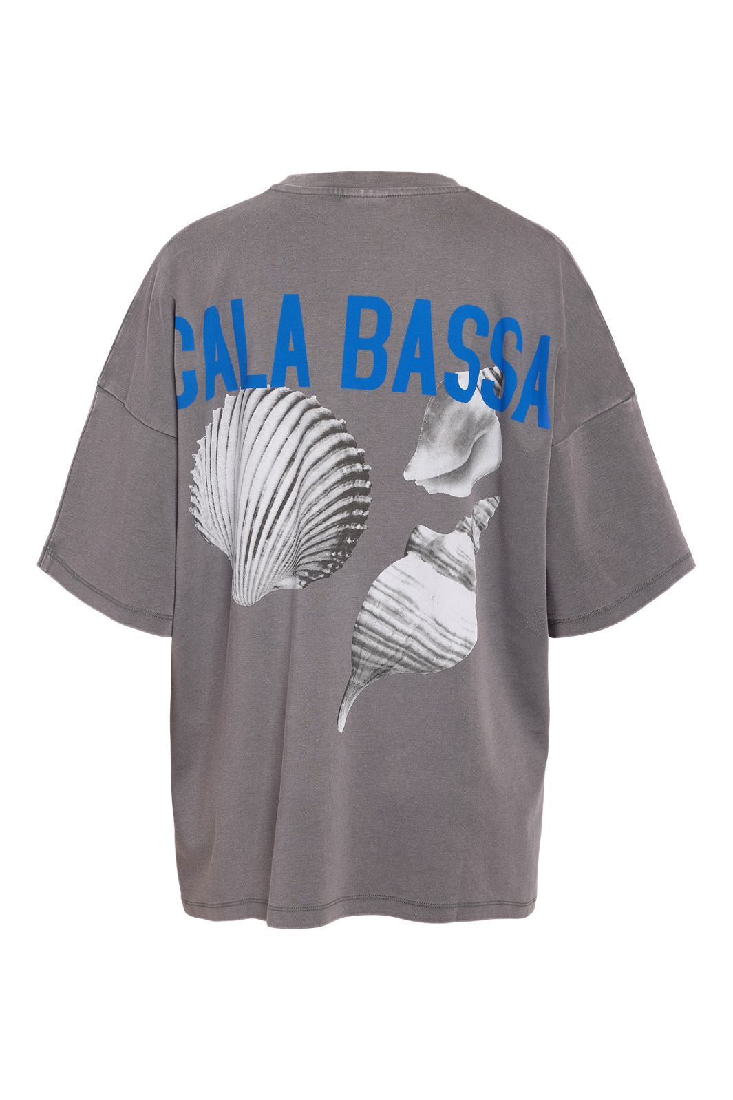 Harmaa t-paita Noisy Maylta, jossa on happopesu-efekti ja simpukkaprintti. Ylisuuri malli antaa rennon ja tilavan siluetin lyhyillä hihoilla ja pyöreällä kaula-aukolla.