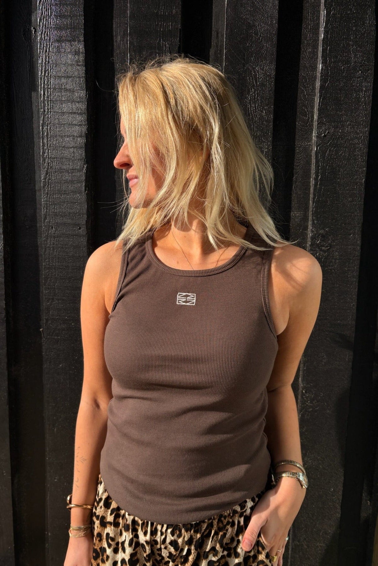 Suklaaruskea tanktoppi Noisy Maylta, jossa on pyöreä kaula-aukko ja hihaton muotoilu. Tiukka malli, jossa on pieni brodeerattu logo edessä.
