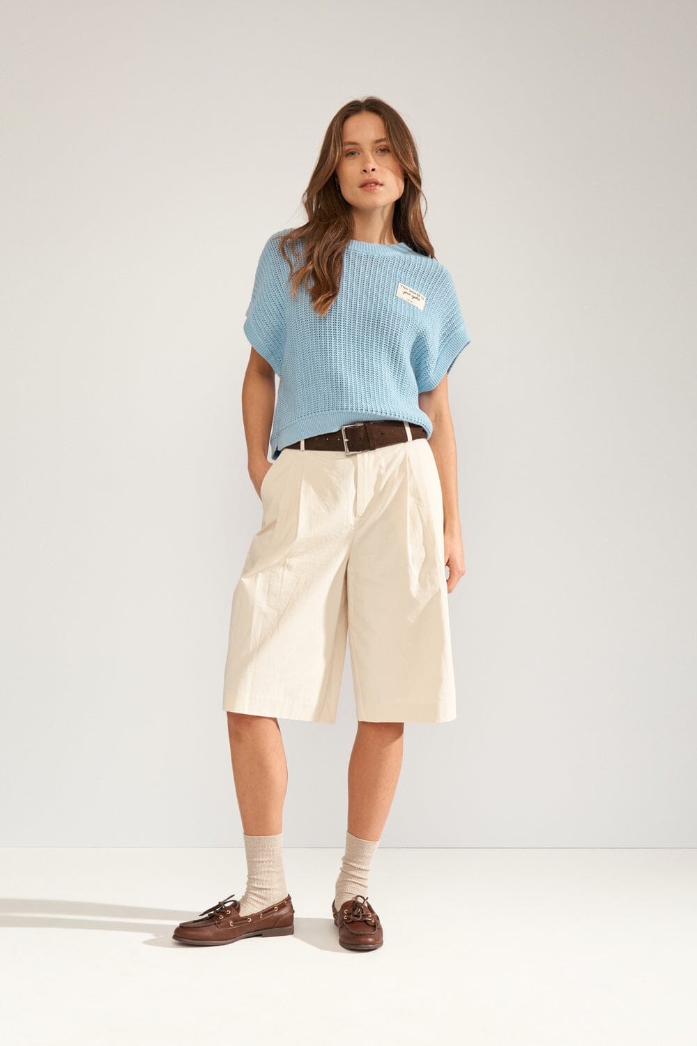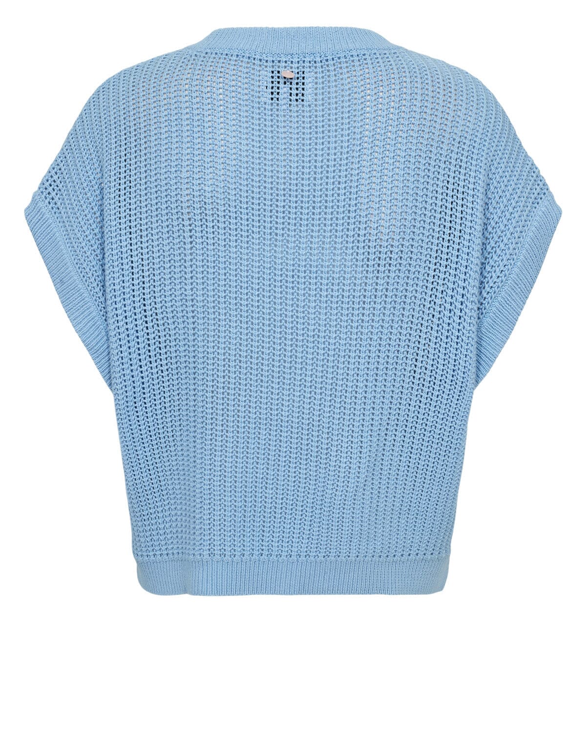 Vaaleansininen Nümph-neulepusero, joka on valmistettu puuvillasta ja jossa on rakenteellinen neulepinta. Neulepuserossa on lyhyet hihat ja pyöreä pääntie.