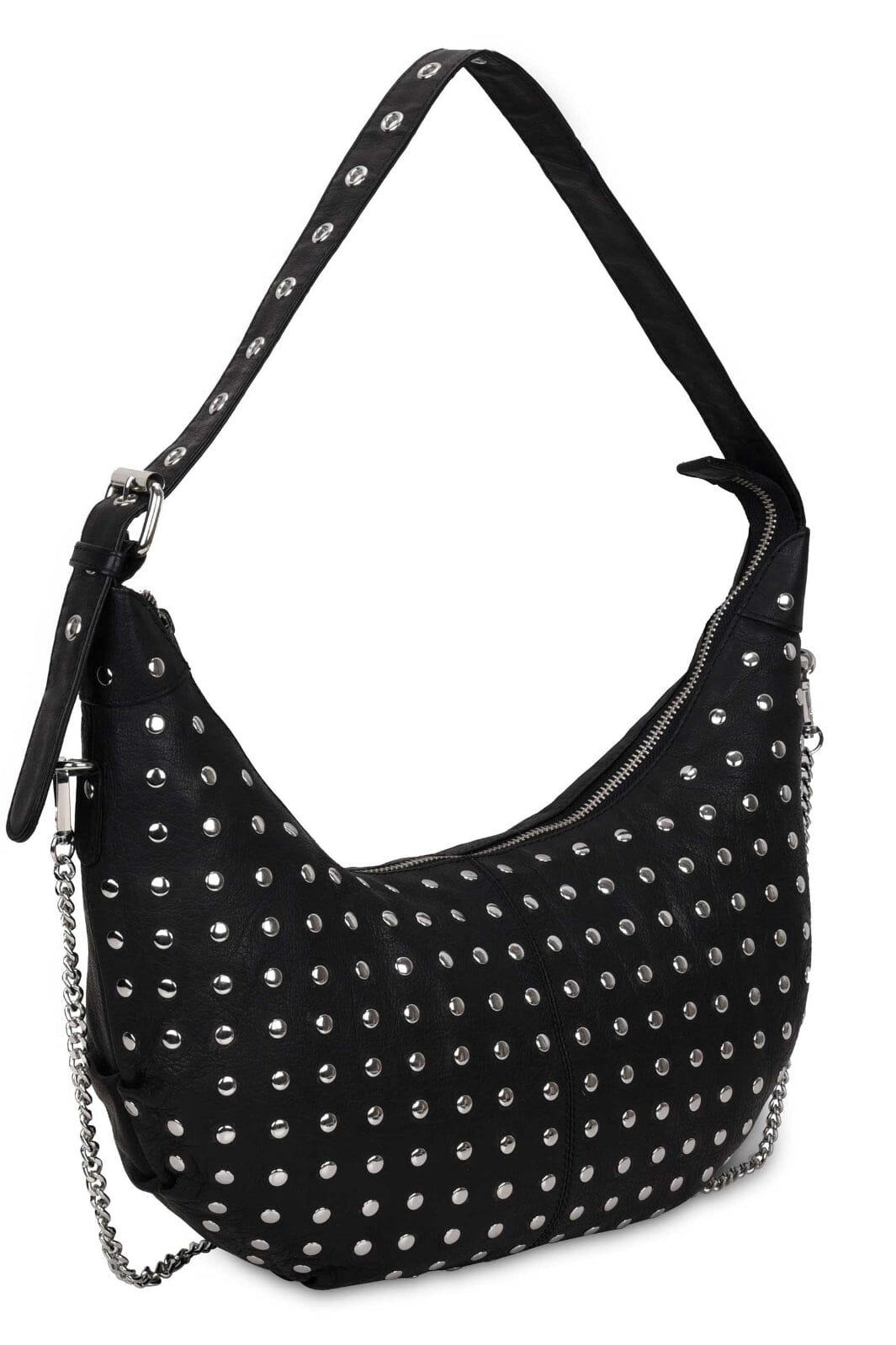 Musta nahkalaukku Núnoolta hopeanvärisillä niiteillä. Laukku on kaareva ja varustettu vetoketjulla sekä sisäisellä vetoketjullisella taskulla.