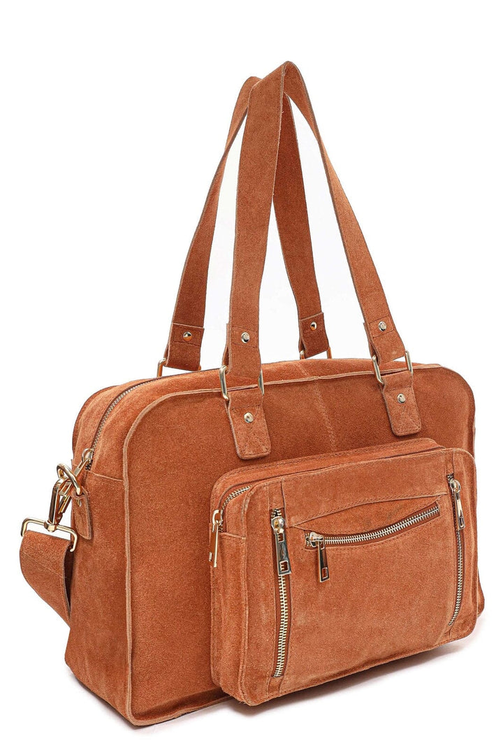 Käsilaukku Núnoolta toffee-värisestä mokasta kultaisilla yksityiskohdilla. Laukussa on useita lokeroita ja käytännöllinen vetoketjullinen tasku edessä pientavaroille.