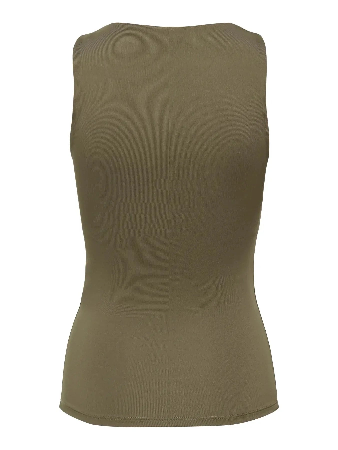 Hihaton toppi Onlylta vihertävän ruskeassa sävyssä. Topissa on vartaloa myötäilevä istuvuus ja pyöreä pääntie.