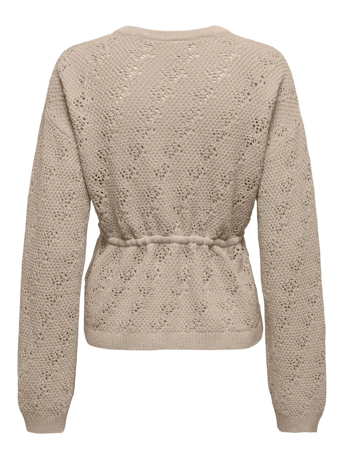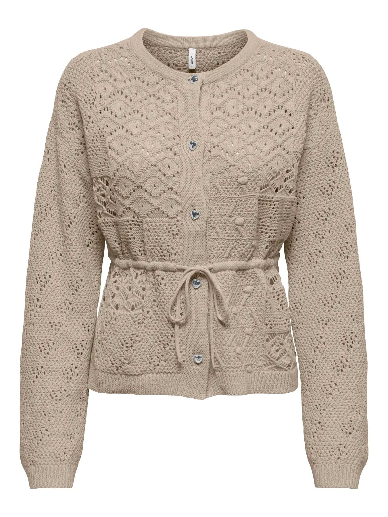 Beige neuletakki Onlylta, jossa on sydämenmuotoiset hopeanväriset napit. Neuletakki on valmistettu 70 % kierrätetystä puuvillasta ja 30 % kierrätetystä polyesteristä avoimesta neuloksesta.