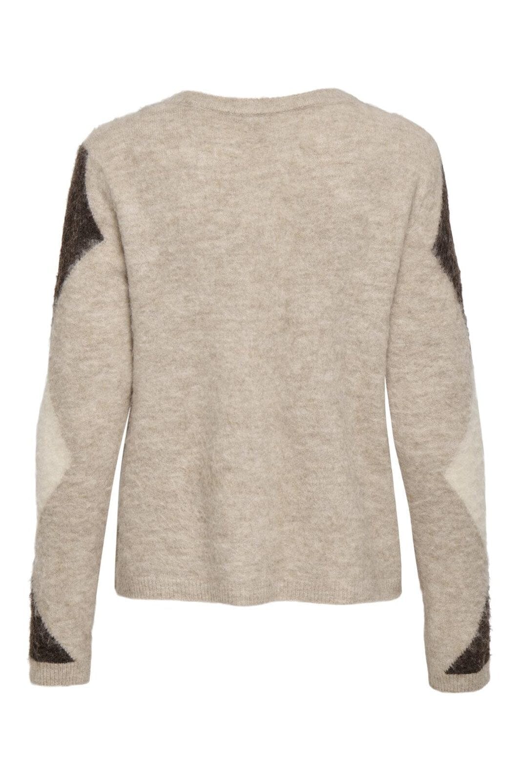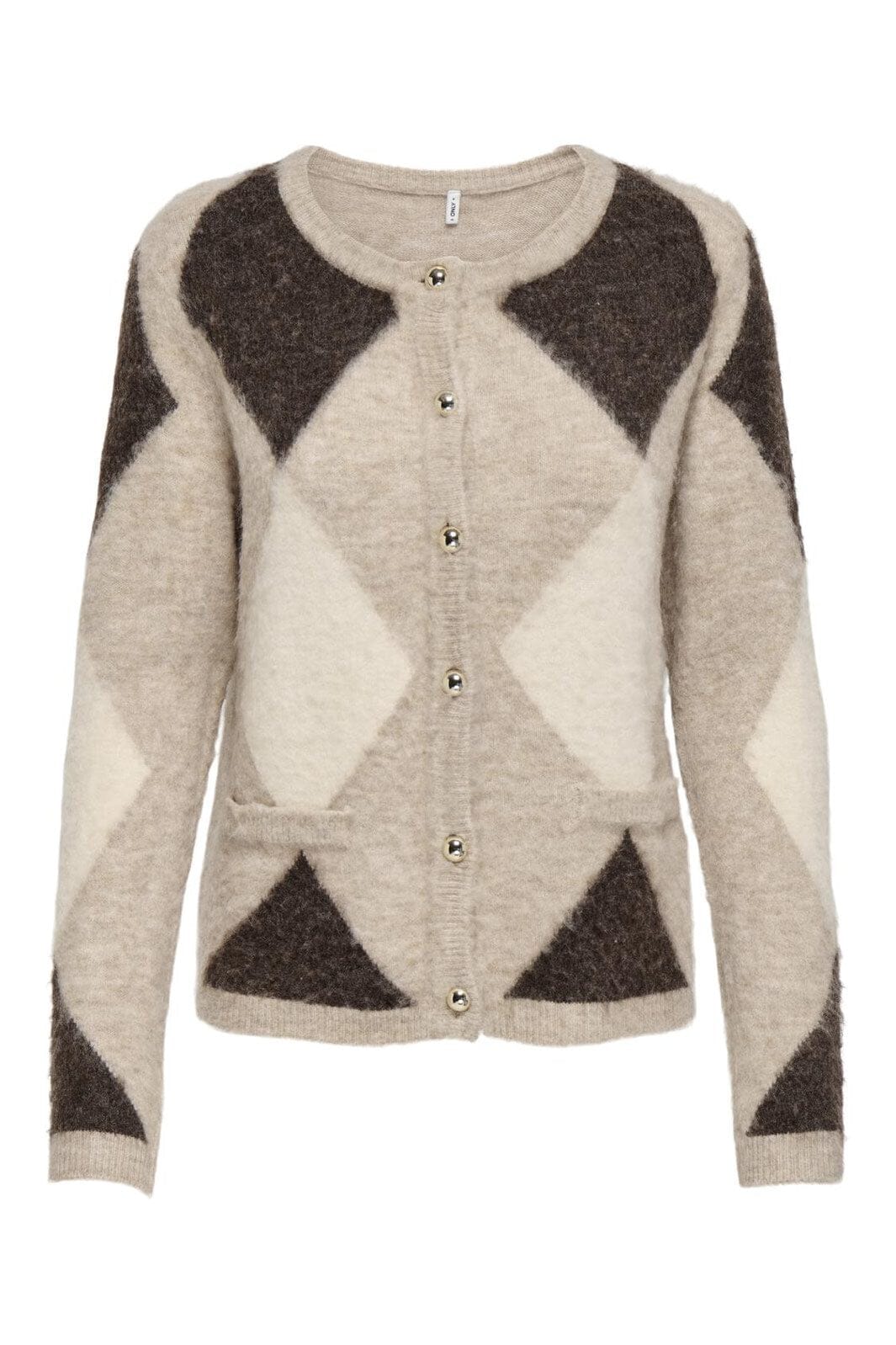 Cardigan Onlylta, jossa on geometrinen kuvio ruskeissa ja beigeissä sävyissä. Siinä on pyöreä kaula-aukko, pitkät hihat ja sivutaskut. Kulta-napit koristavat etuosaa.