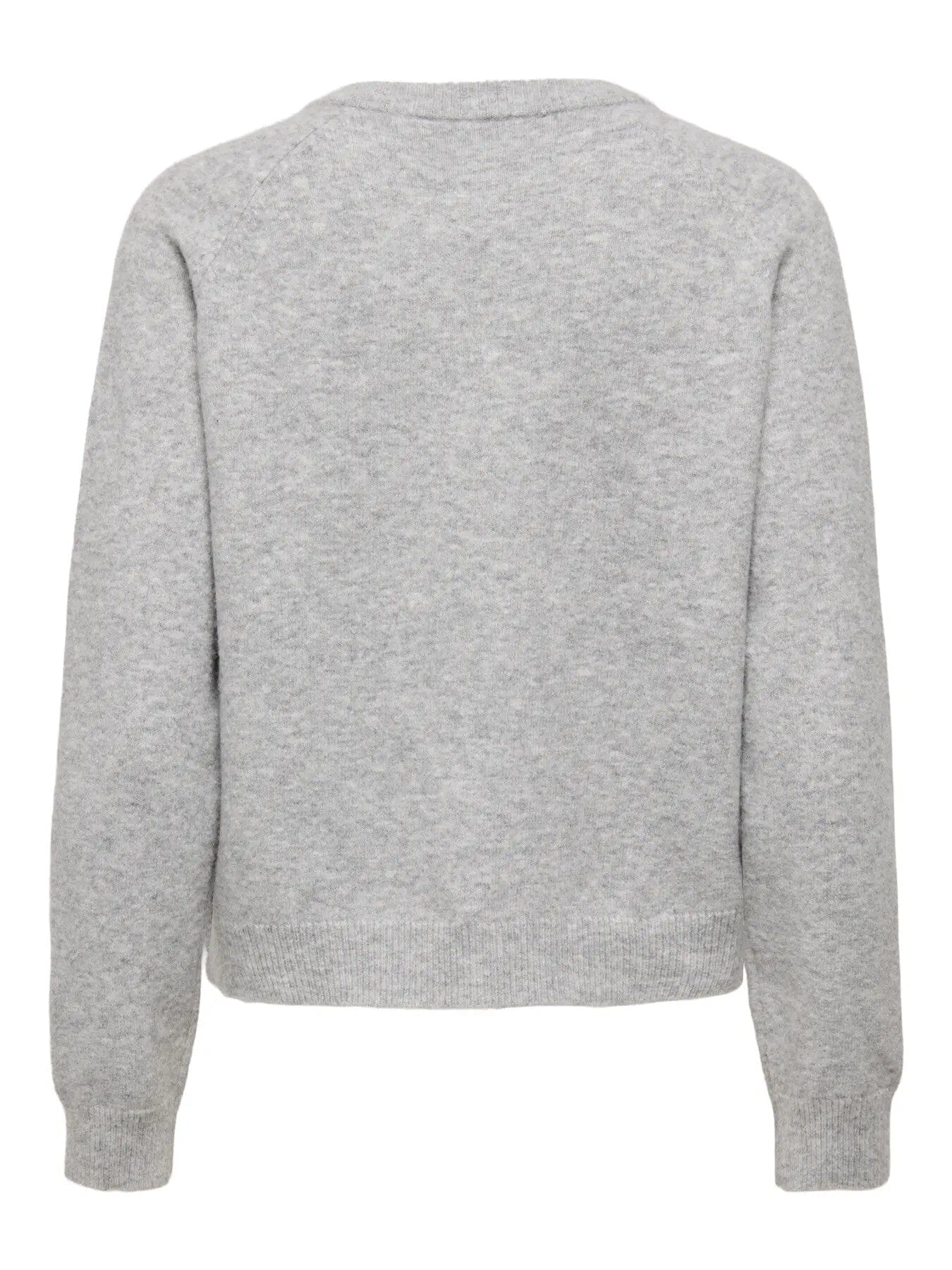Vaaleanharmaa neuletakki Onlylta, jossa on hopeanväriset rusetinmuotoiset napit. Neuletakissa on pyöreä pääntie ja se on valmistettu sileästä neuloksesta.