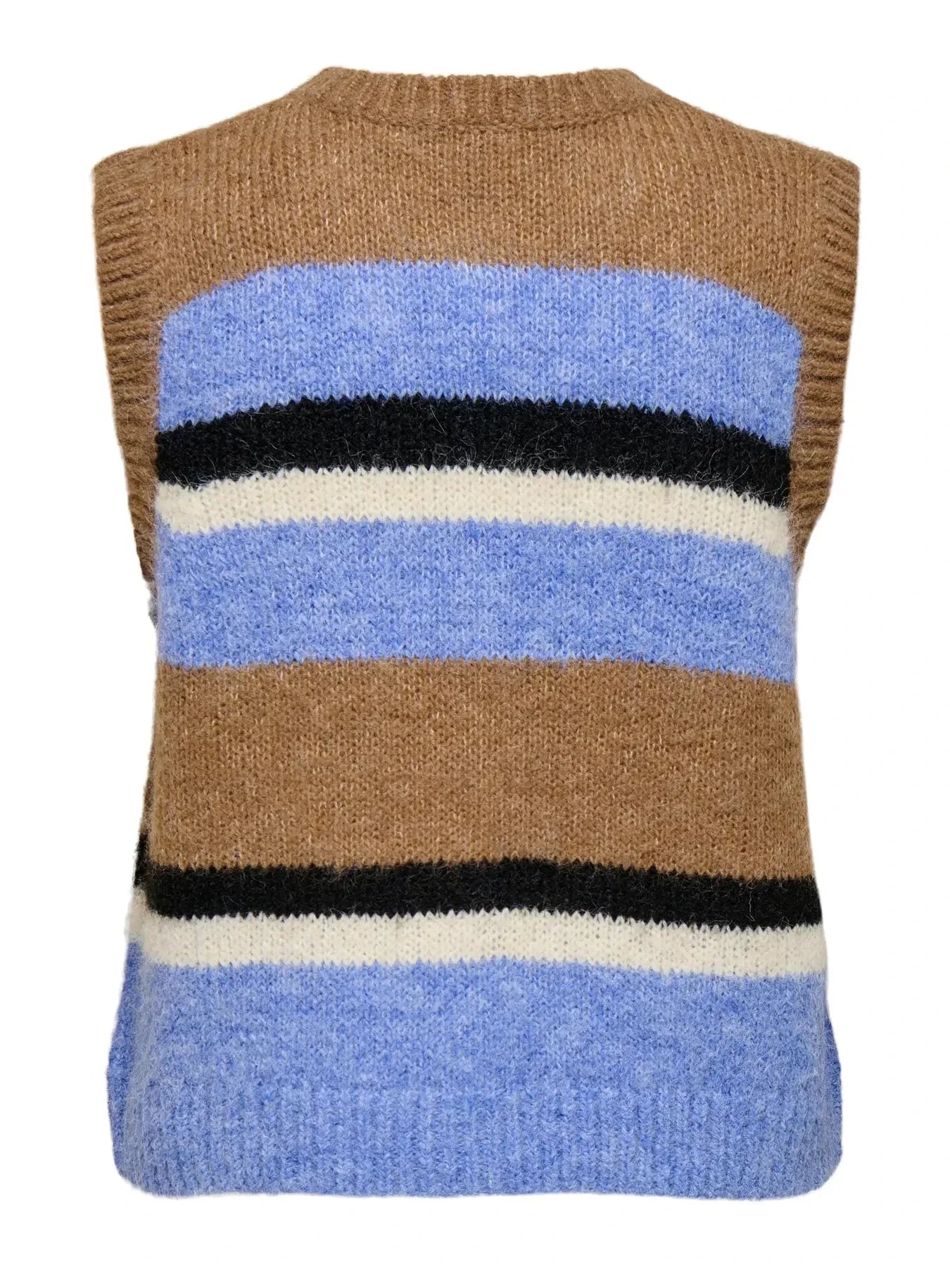 Raidallinen liivi Onlyltä, jossa on leveät vaakasuorat raidat ruskeassa, vaaleansinisessä, mustassa ja valkoisessa. Liivissä on mustat napit ja pyöreä kaula-aukko.