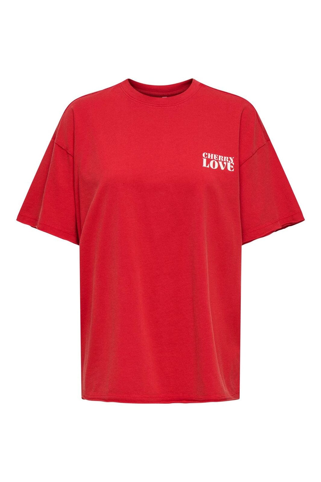 Punainen oversized T-paita Onlylta, valmistettu 100 % luomupuuvillasta. T-paidassa on kirsikkapainatus ja teksti edessä ja selässä.